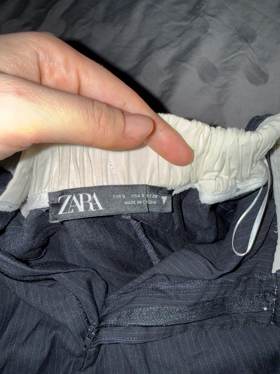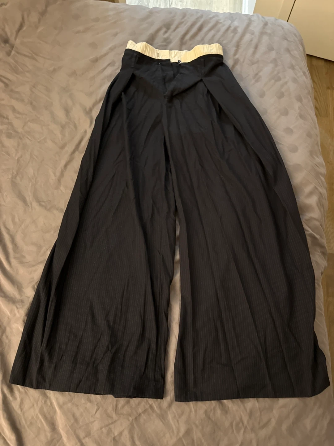 ZARA black wide leg pants with a pinstripe pattern. Elastic waistband for comfort. Made in China. Size S (EUR S, USA 4/6).