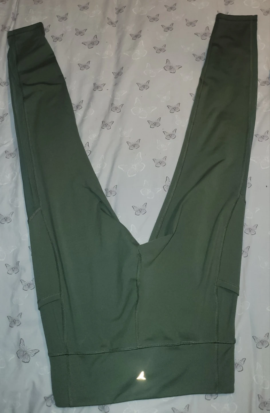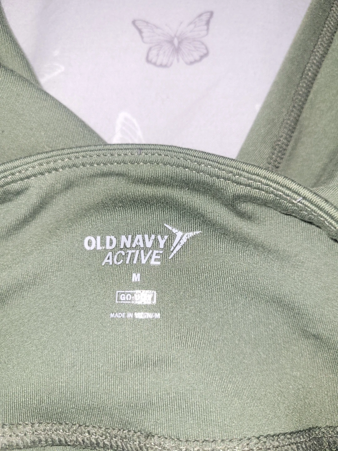 Two pairs of Old Navy Active leggings in size medium. One pair is olive green and the other is black with grey accents. Both feature side pockets.