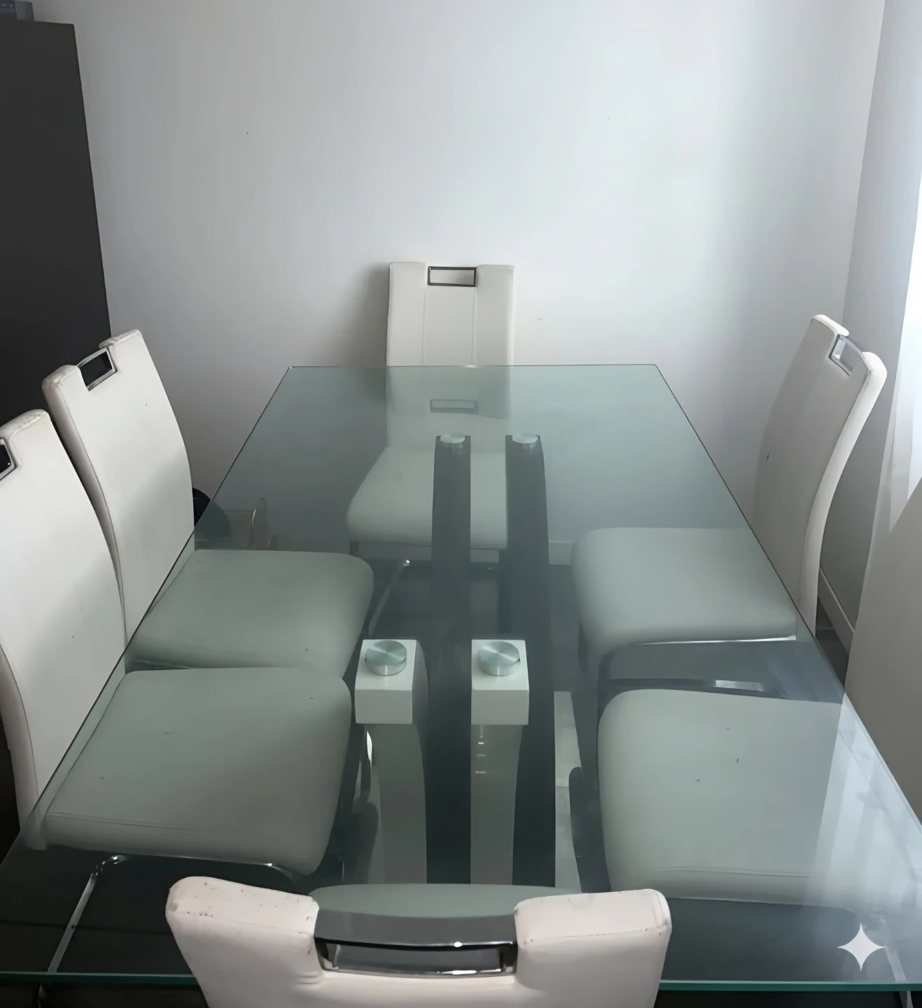 This dining set includes a glass-top table with a white pedestal base and six white chairs with chrome legs. Seats six people comfortably. Perfect for family dinners or entertaining guests!