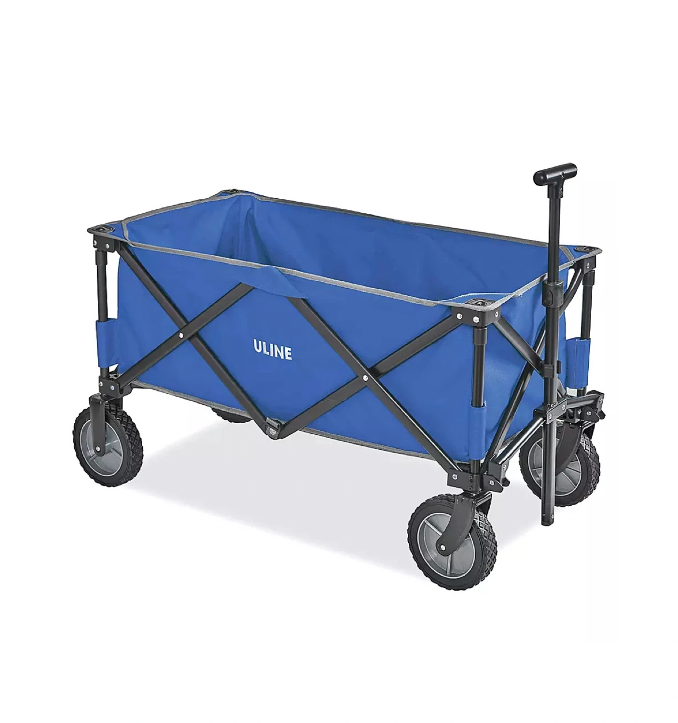 Strong steel wagon with smooth wheels and large capacity. Folds easily for storage. Great for outdoor use, shopping, camping, or garage work.