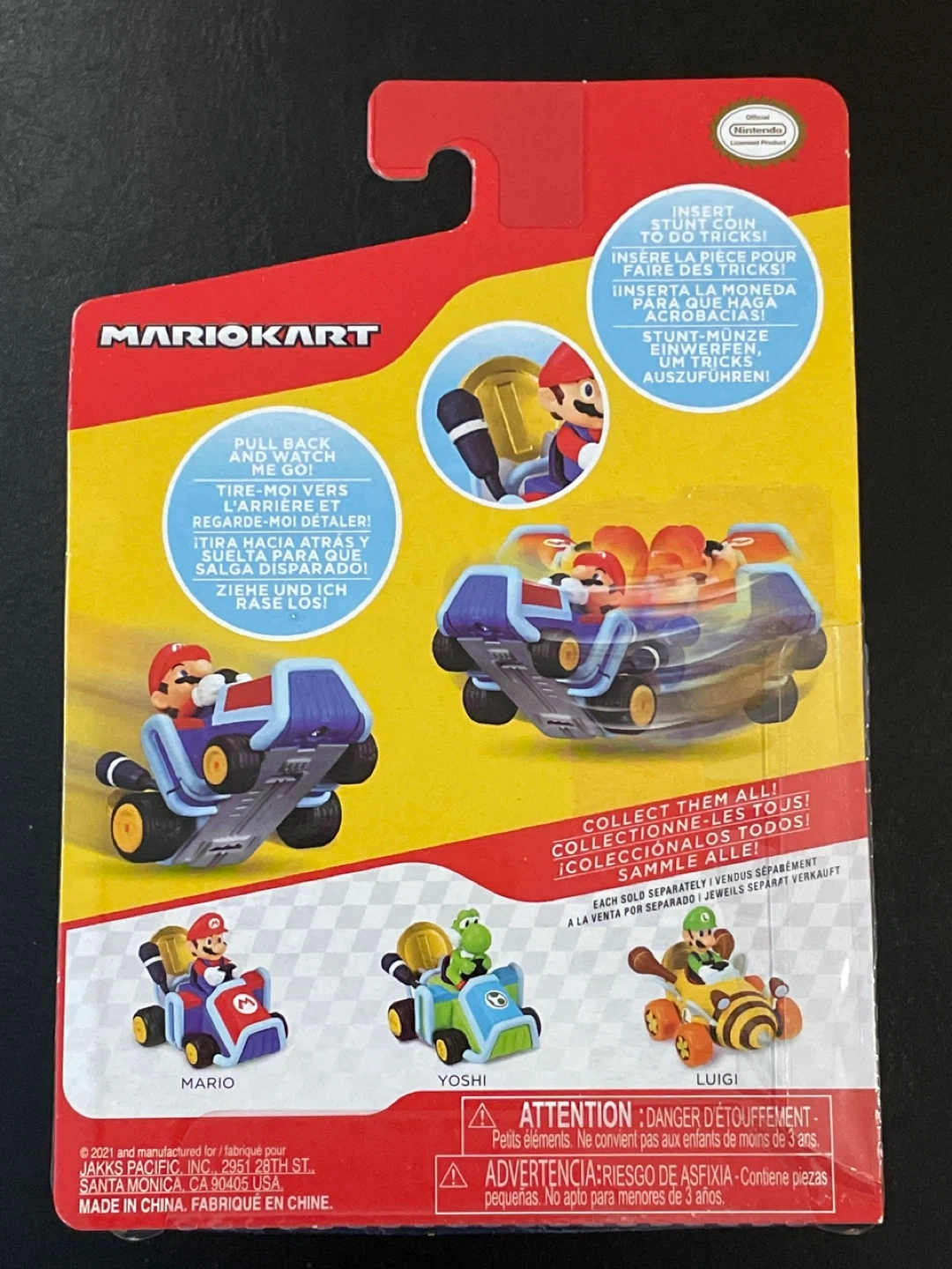 Zoom into action with this new Mario Kart Coin Racers toy! Featuring Mario in his signature kart, this pull-back racer is ready for sweet stunts and super cascades. Collect the coin, pull back and watch him go! Vroom, vroom!