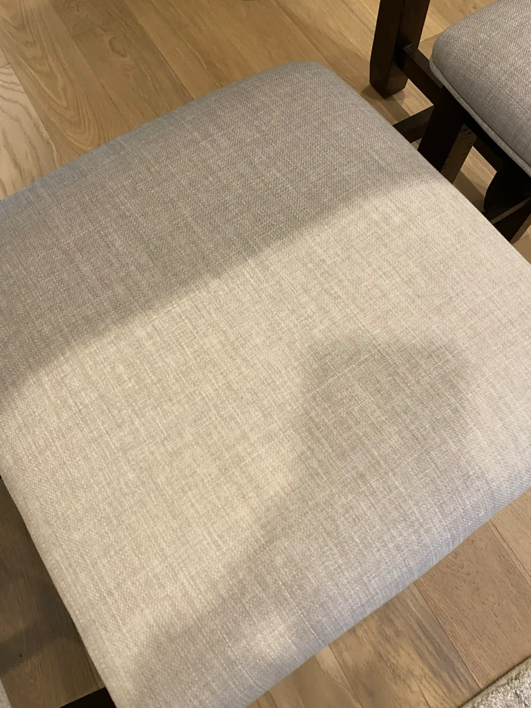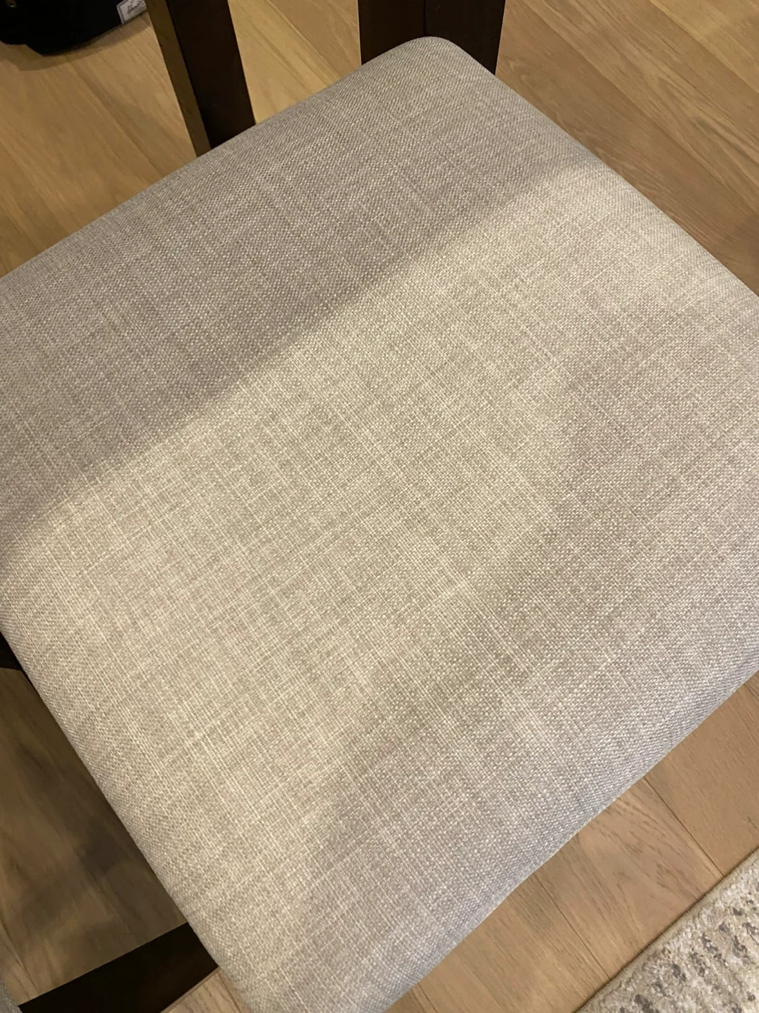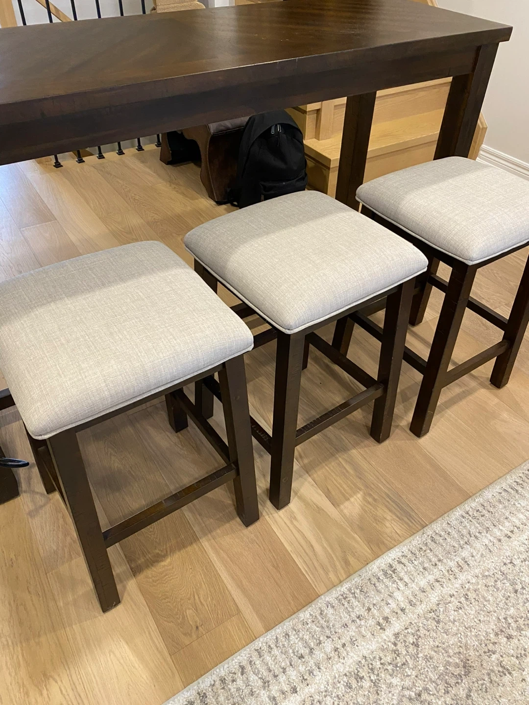 Selling a dining table with three matching stools. The table has a beautiful wood grain pattern, and the stools have light beige upholstered seats. They're in great shape and ready for a new home!