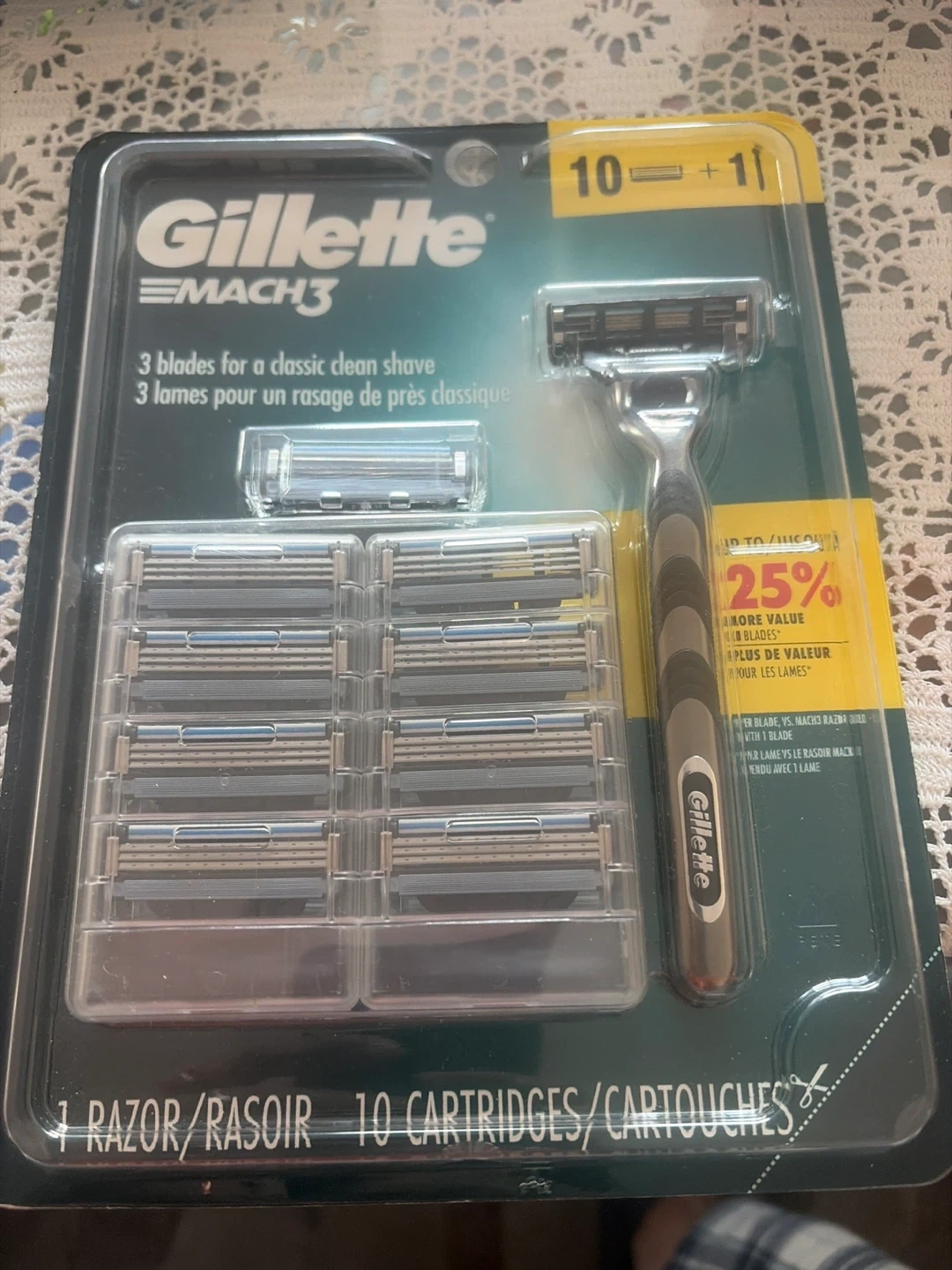This Gillette Mach3 razor comes with 10 replacement cartridges, plus one extra for a total of 11. It features 3 blades for a clean shave. Additional cartridges are packaged separately.