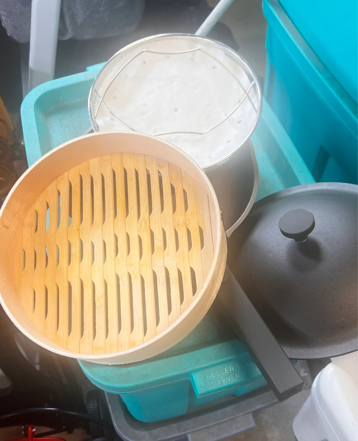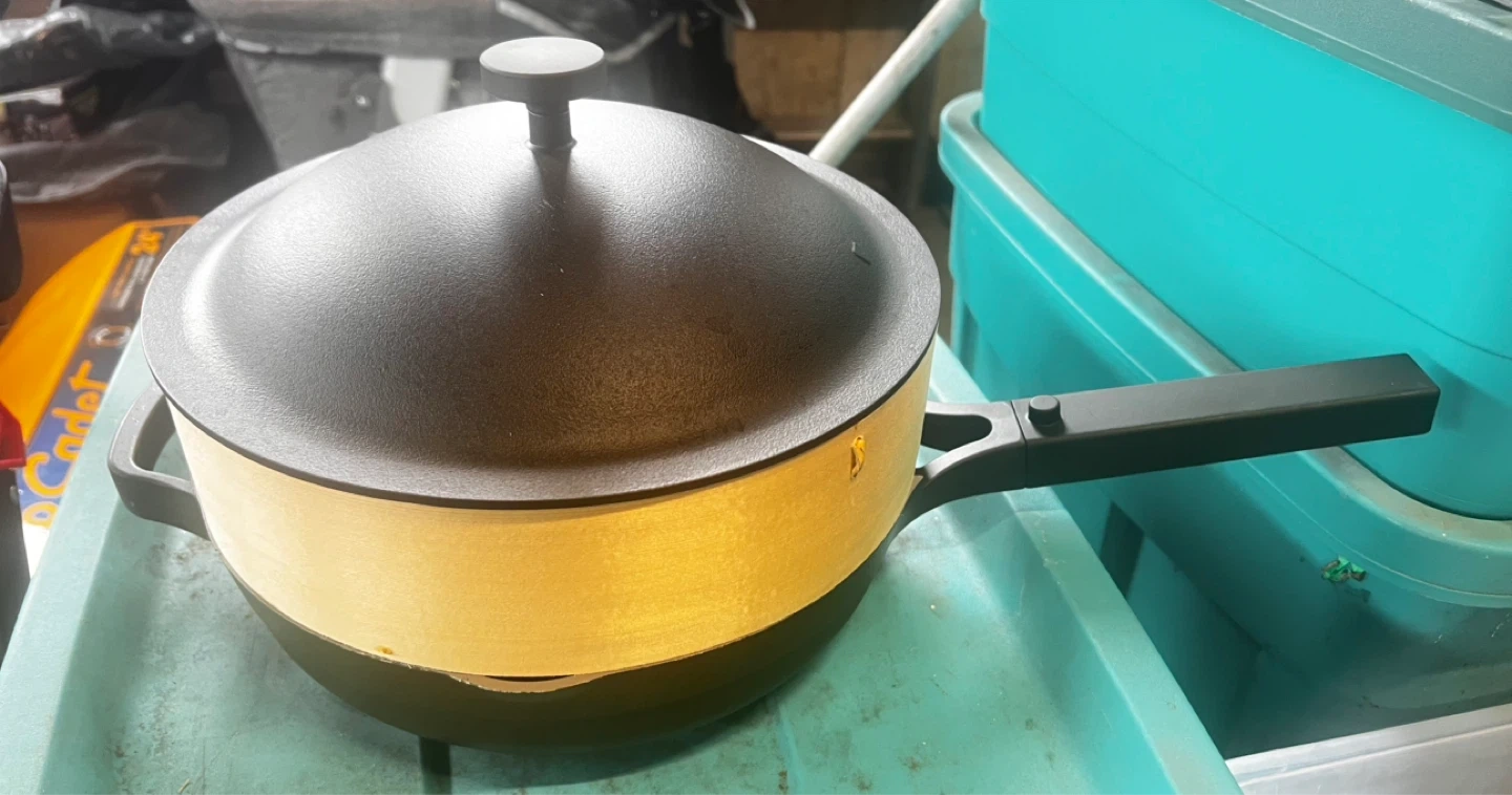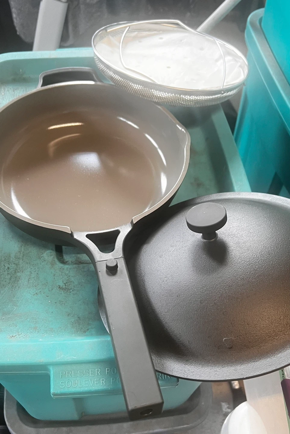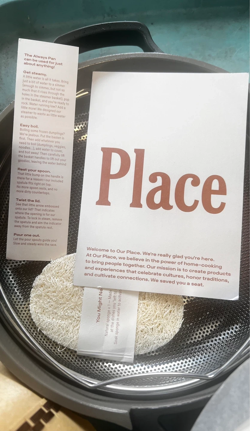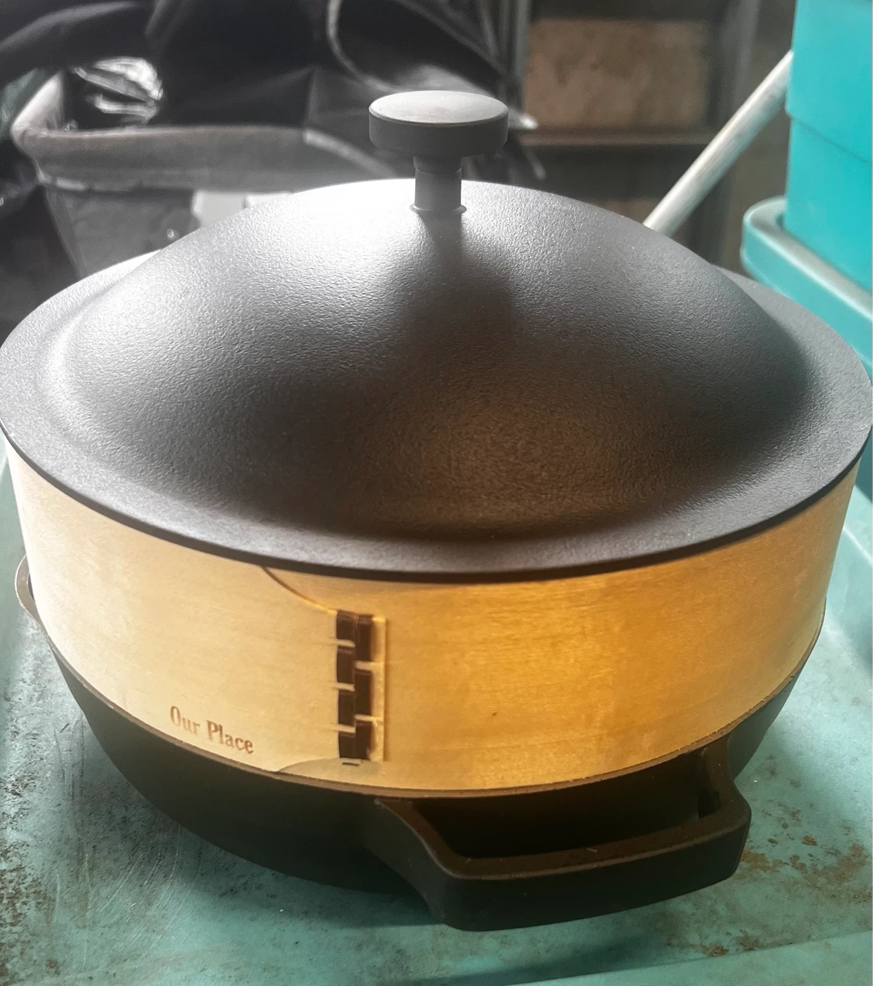 This is the Our Place Always Pan with a bamboo steamer basket. It's made with a cast iron base and non-stick coating. The pan is great for steaming, frying, and sautéing food!