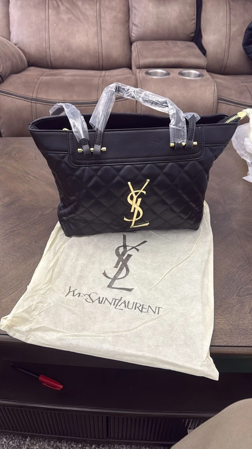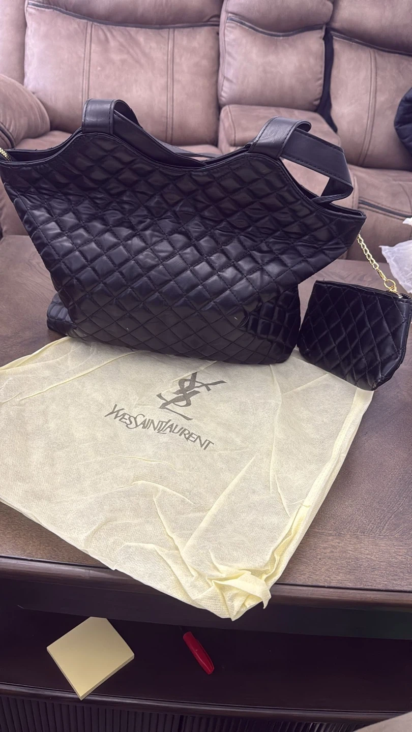 This Yves Saint Laurent tote bag is black with a quilted design and gold YSL logo. It comes with a matching zippered pouch and a dust bag. Bag features top handles and a zip closure.