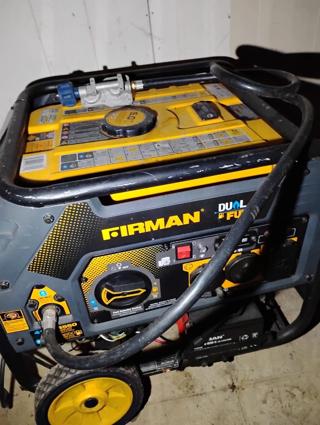 This Firman generator runs on dual fuel. It's a portable unit with wheels for easier transport. It's useful for power outages or outdoor events. Make an offer