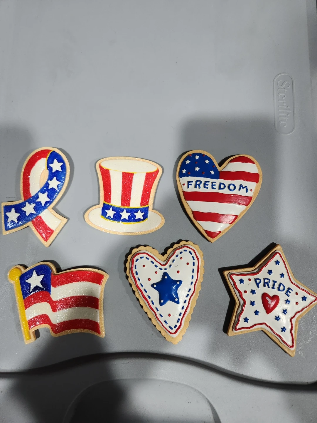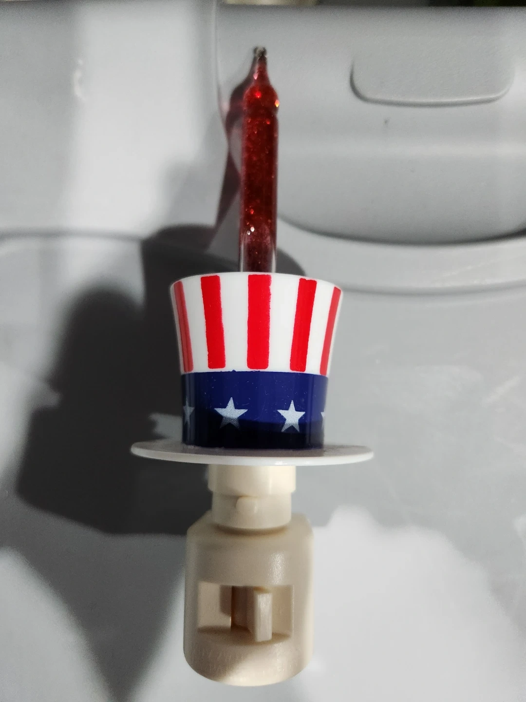 This set includes various patriotic decorations featuring Uncle Sam figures, flags, hearts, stars, and a ribbon design. Some pieces have 'Freedom' and 'Pride' text. Also includes a patriotic hat-shaped light topper.