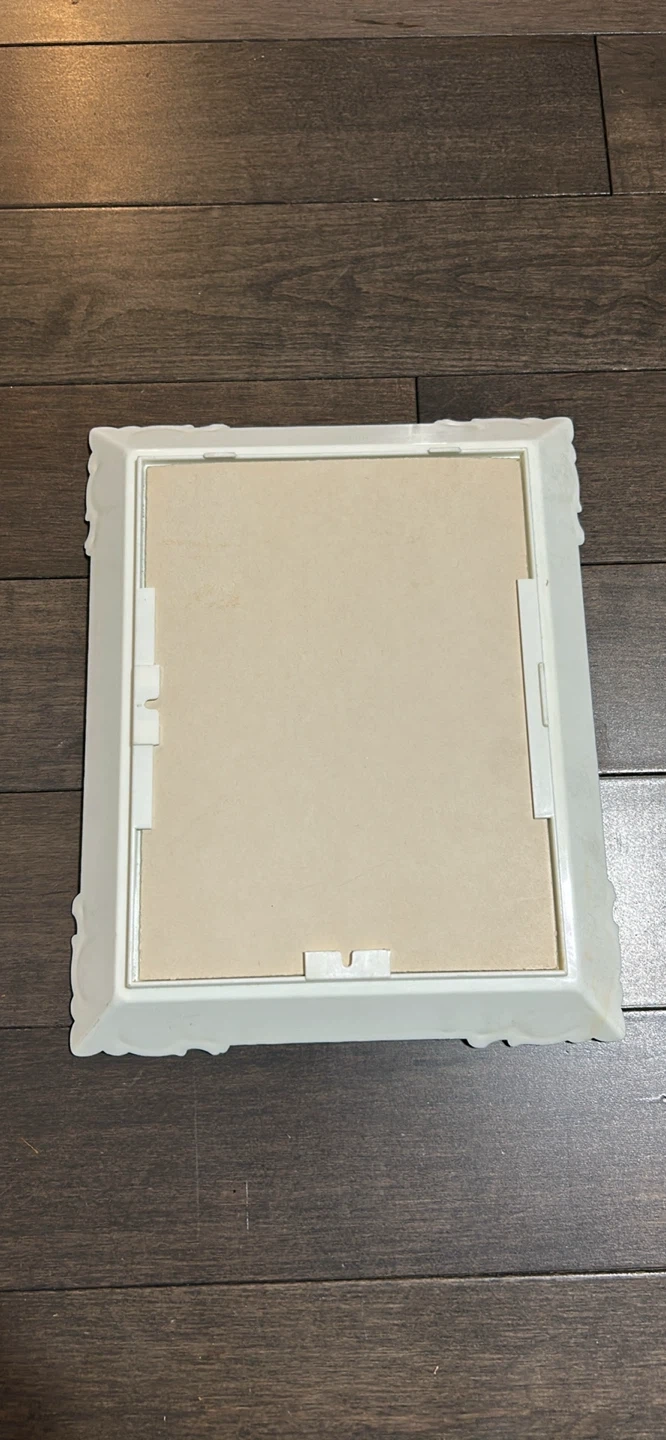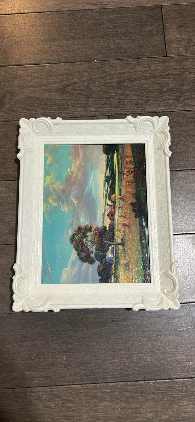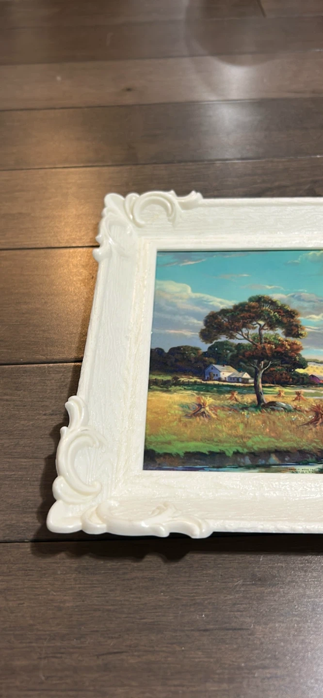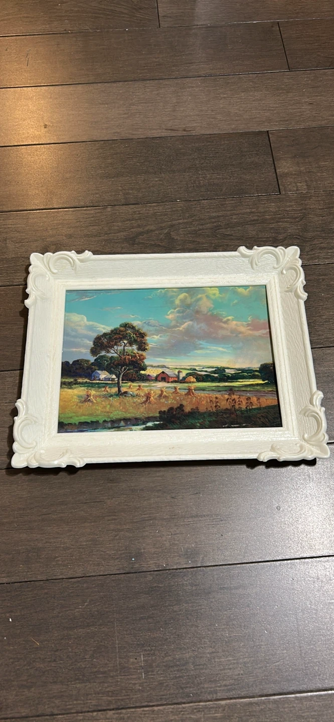 White ornate plastic frame surrounding a serene landscape painting. It depicts a tree in a field with a farmhouse and barn in the background. A lovely piece of wall art!