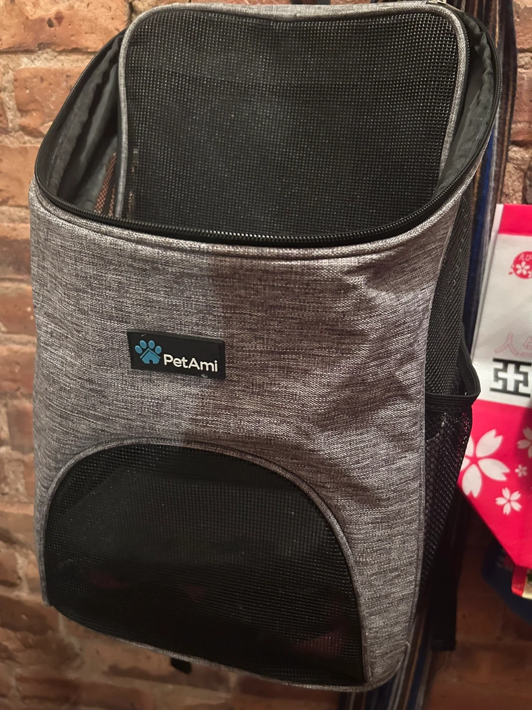 PetAmi pet carrier backpack in gray. It has mesh ventilation on the sides and front. Zips open for easy access. Great for small pets!