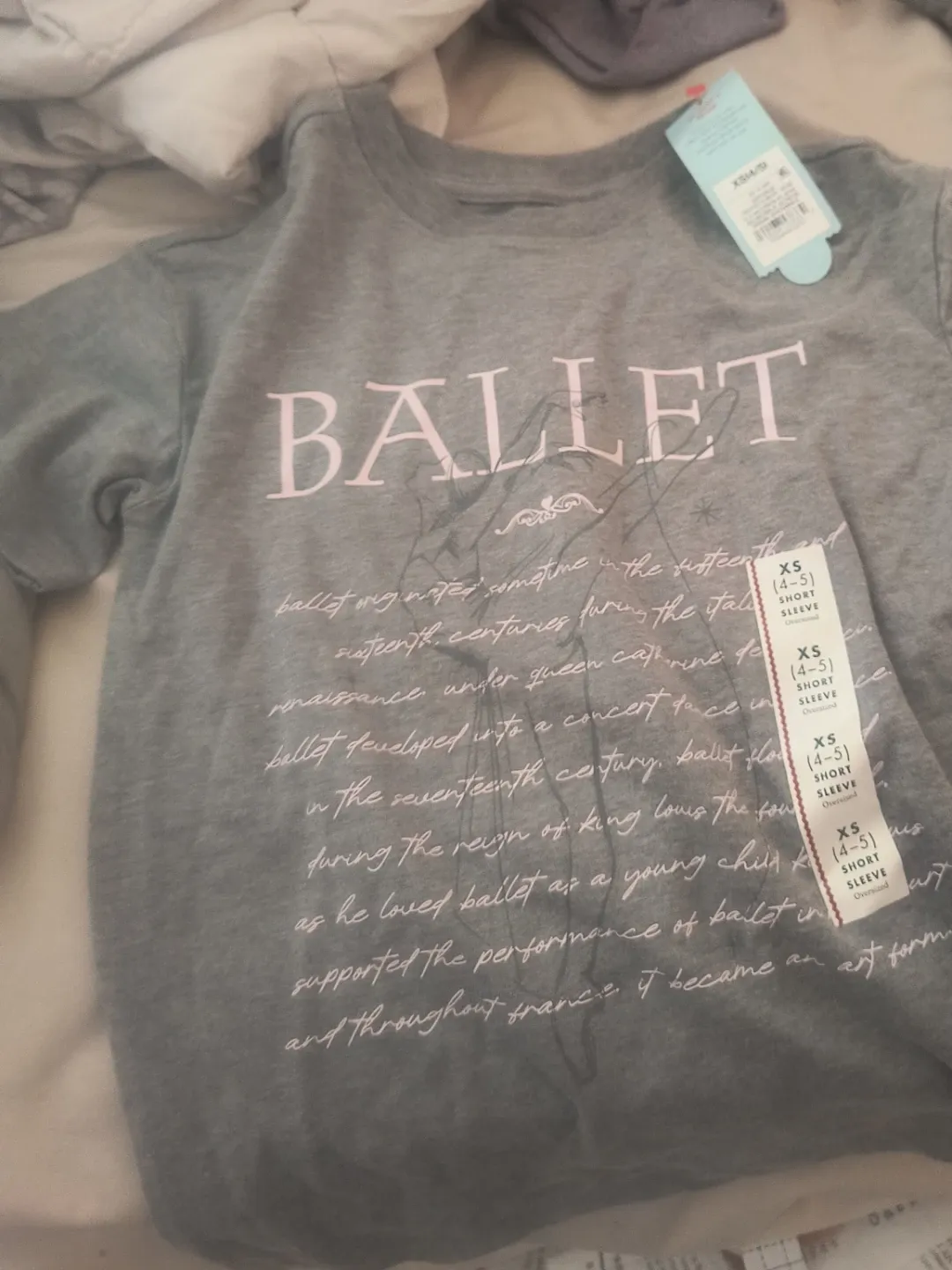 This is a gray, short-sleeve t-shirt with 'BALLET' printed on it in pink. It also has text detailing the history of ballet. Size XS (4-5). New with tags ! Bought by mistake . Wanted it for me
