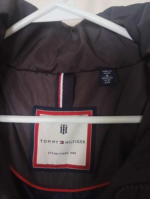 Tommy Hilfiger puffer coat in size small. It's a lovely down-filled coat, perfect for the Canadian winter. There is a hole in the seam of the lining of the right pocket, but it can be easily sewn up.