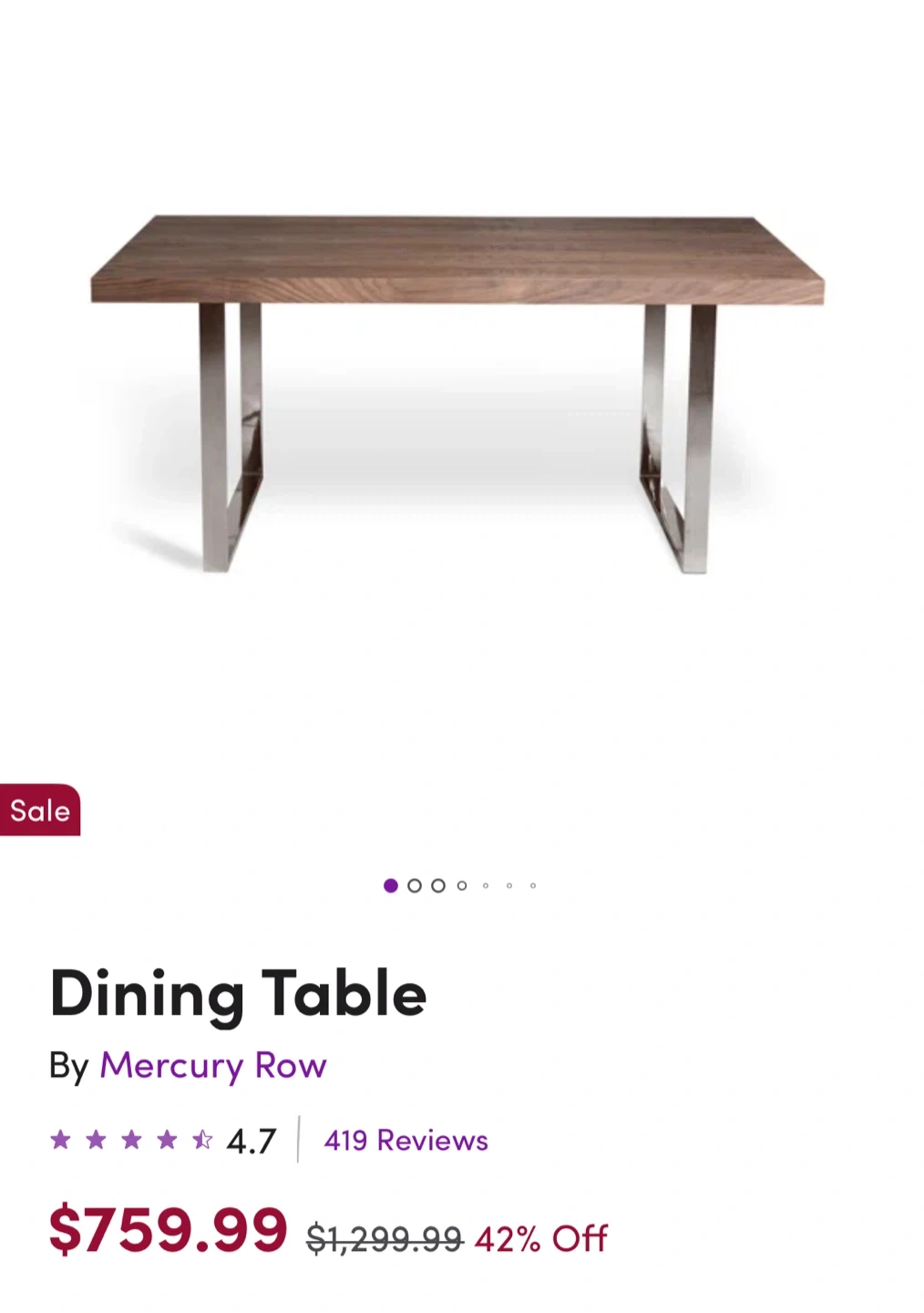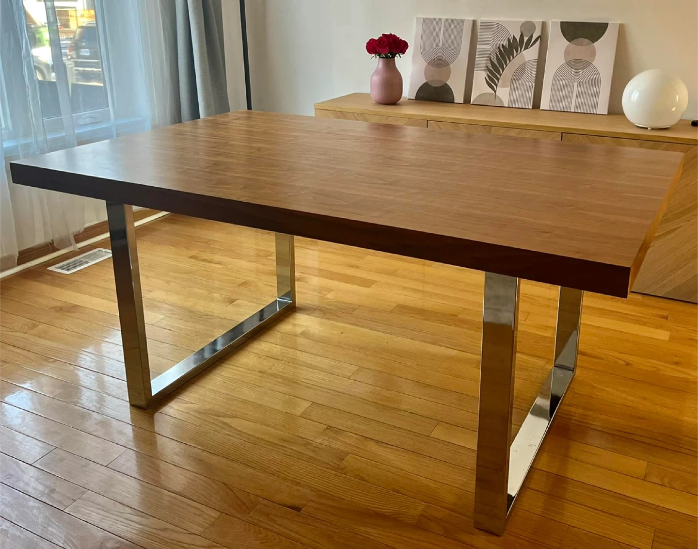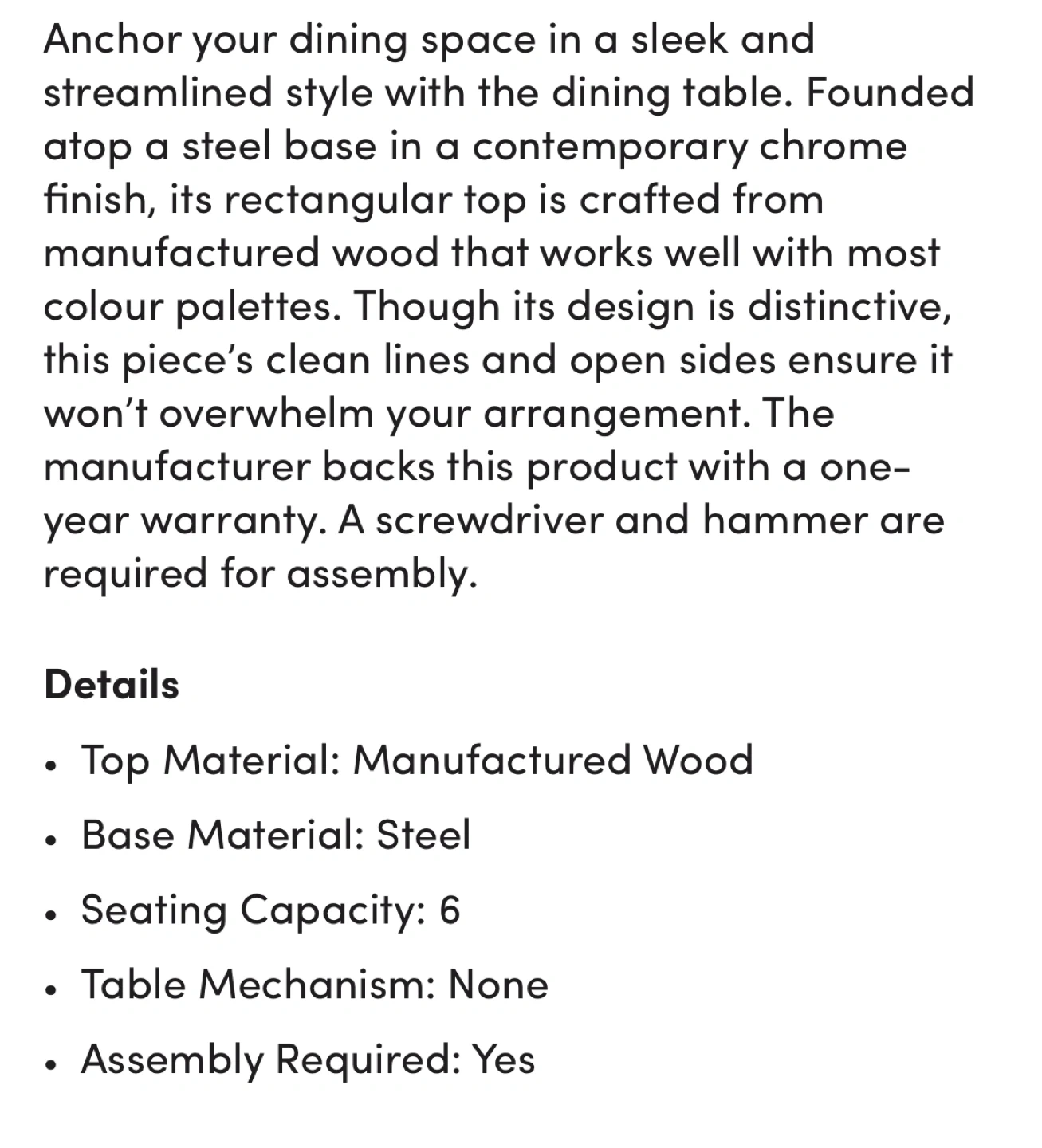 Selling a Mercury Row dining table with a manufactured wood top and steel base. It's a sleek and streamlined style that can anchor your dining space.