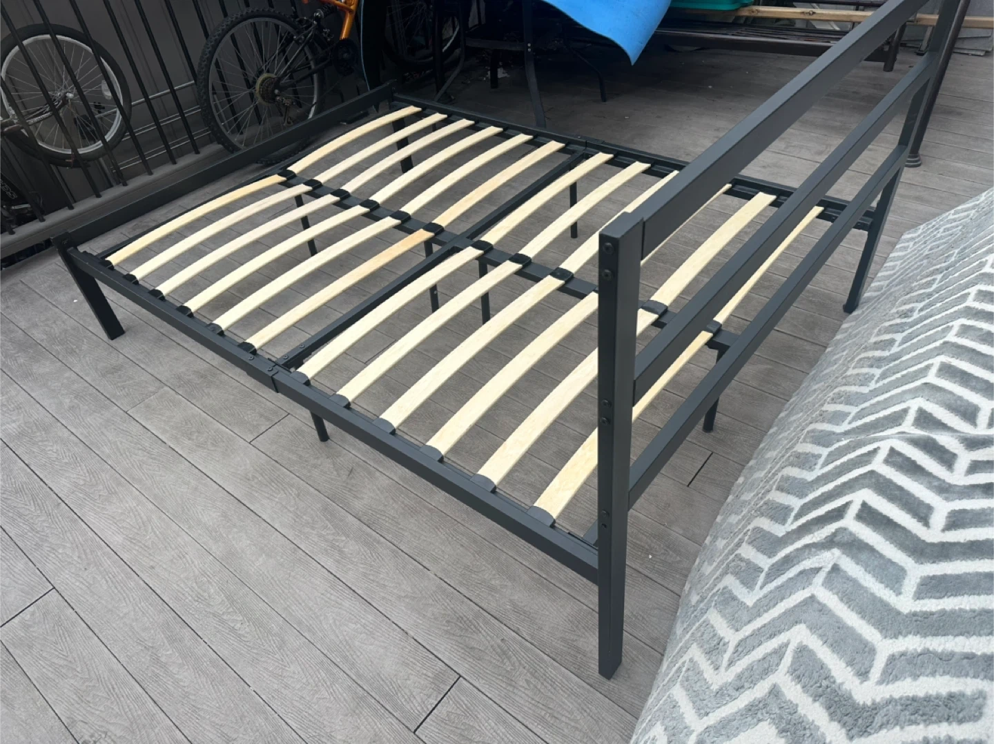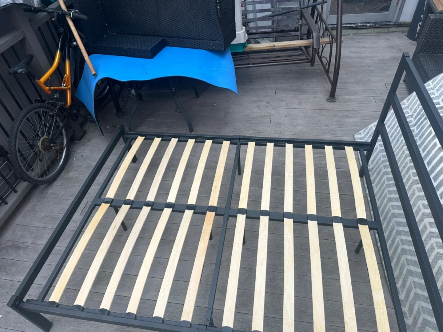 Sturdy metal bed frame with strong wooden slats. No squeaks, no damage, and all slats are solid. Assembled outdoors just for photos.