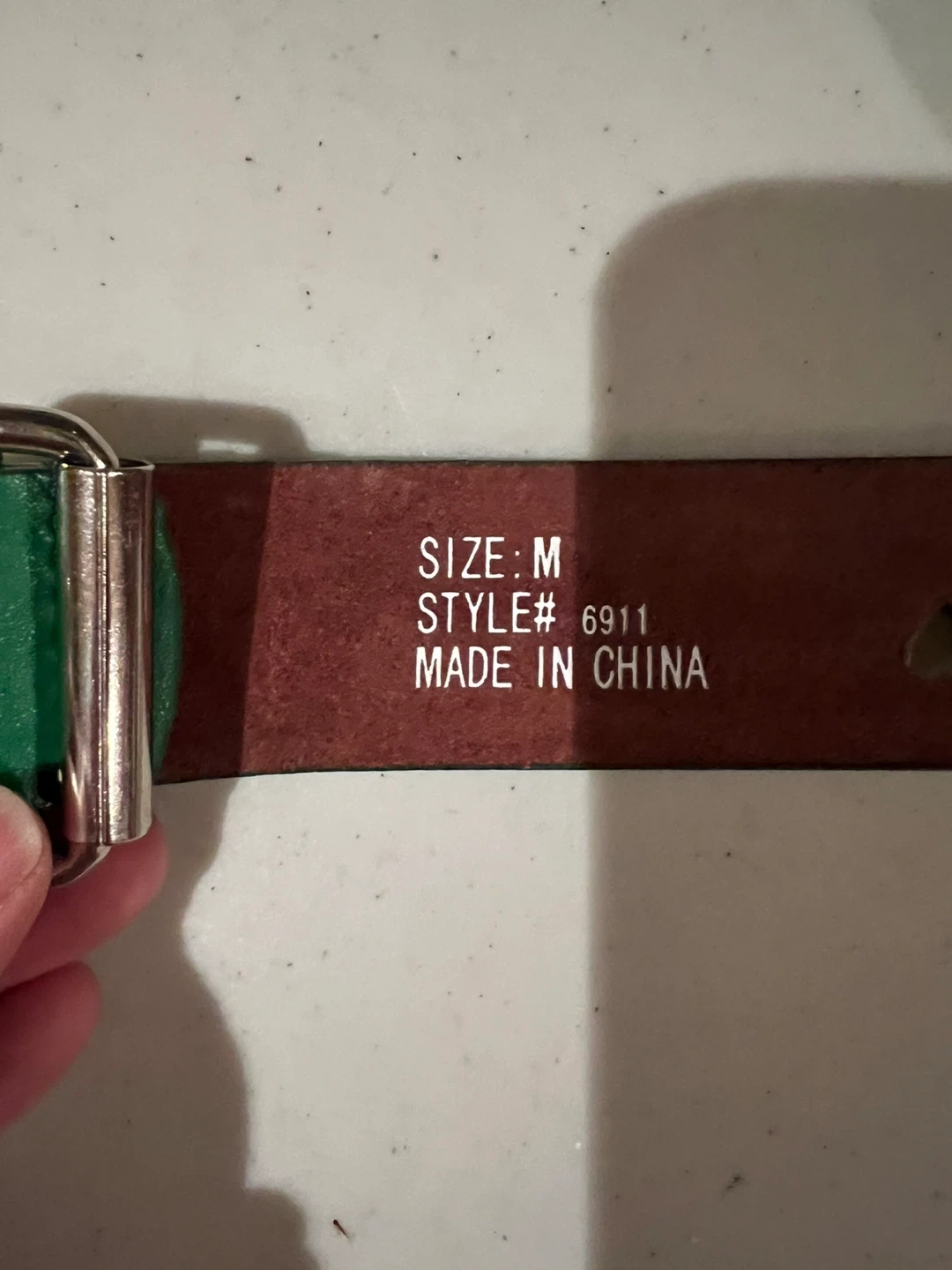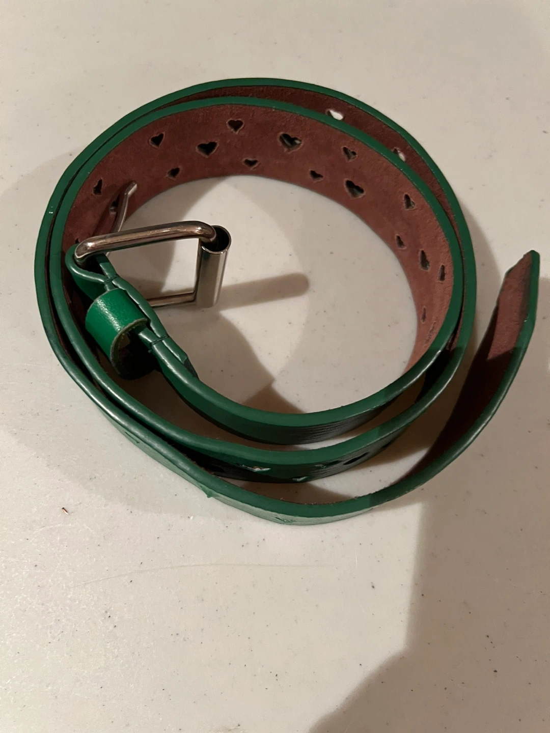 This green belt features a stylish cutout heart design. It's a size medium with a classic silver buckle. The inside is brown faux leather.