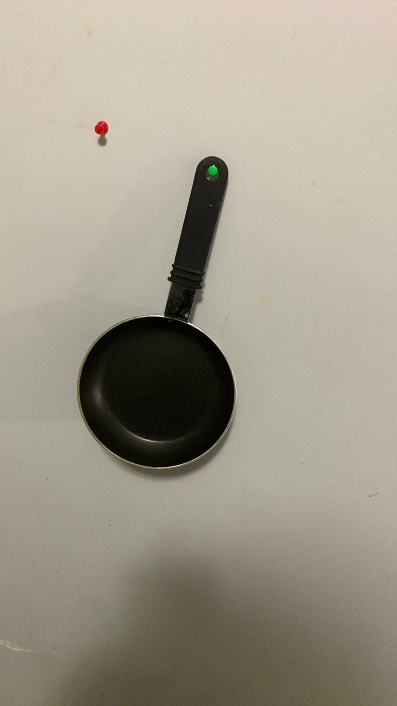 A small black frying pan with a black handle and a green indicator light on the end of the handle. It's great for making single servings of eggs or pancakes!