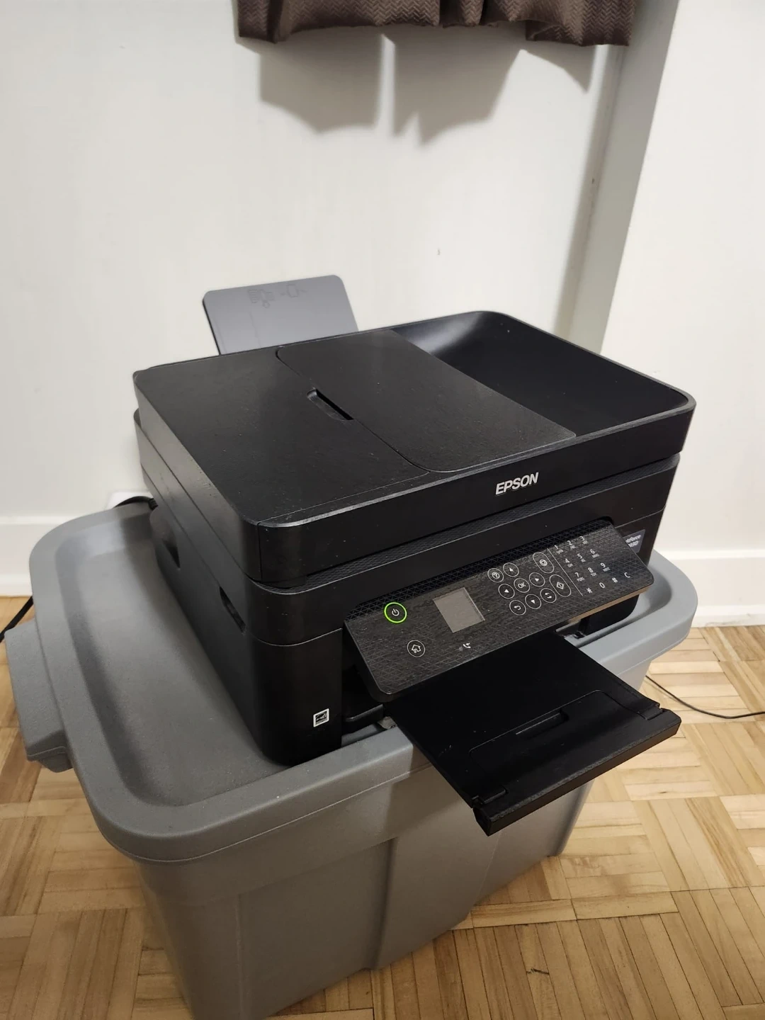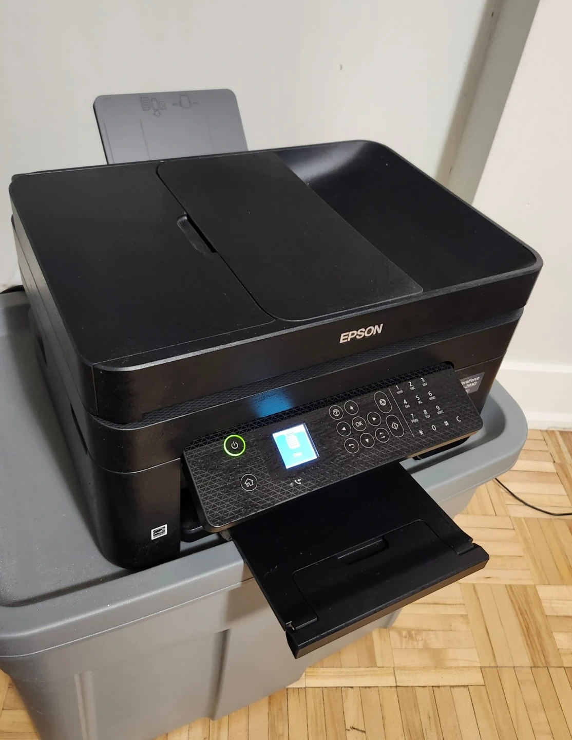 This is an Epson all-in-one printer. It's black and designed for home or office use. It includes scan, copy and fax functions.