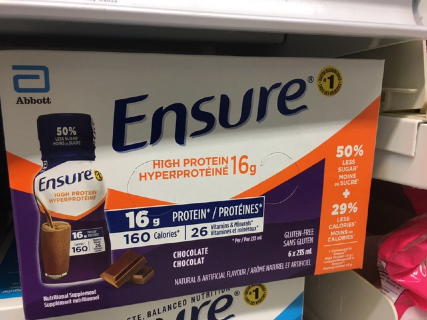 Selling a pack of Ensure High Protein in chocolate flavour. Each pack contains 6 bottles of 235 ml each. It's gluten-free and a source of vitamins and minerals, with 16g of protein per serving. It also has 50% less sugar and 29% less calories