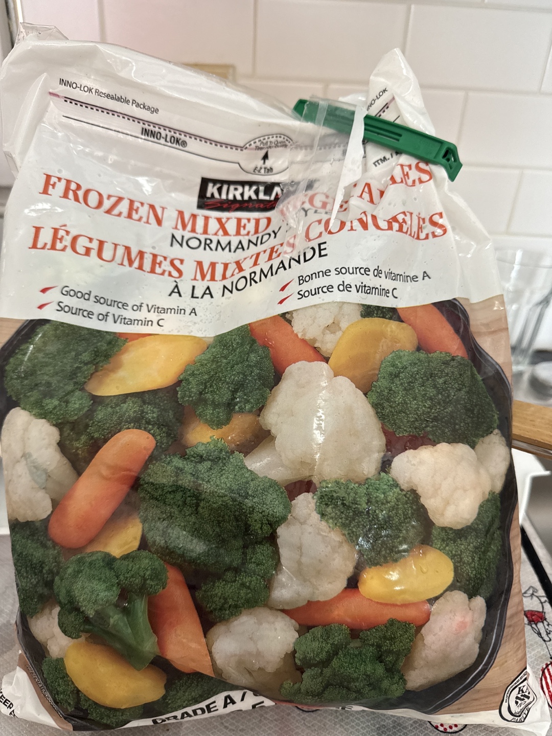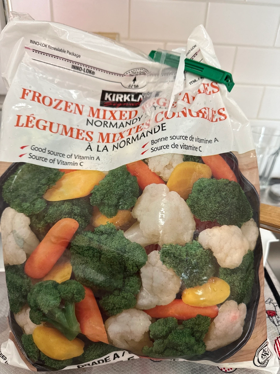 Selling a bag of Kirkland Frozen Mixed Vegetables. It's a mix of Normandy style veggies, and a good source of Vitamin A and C.