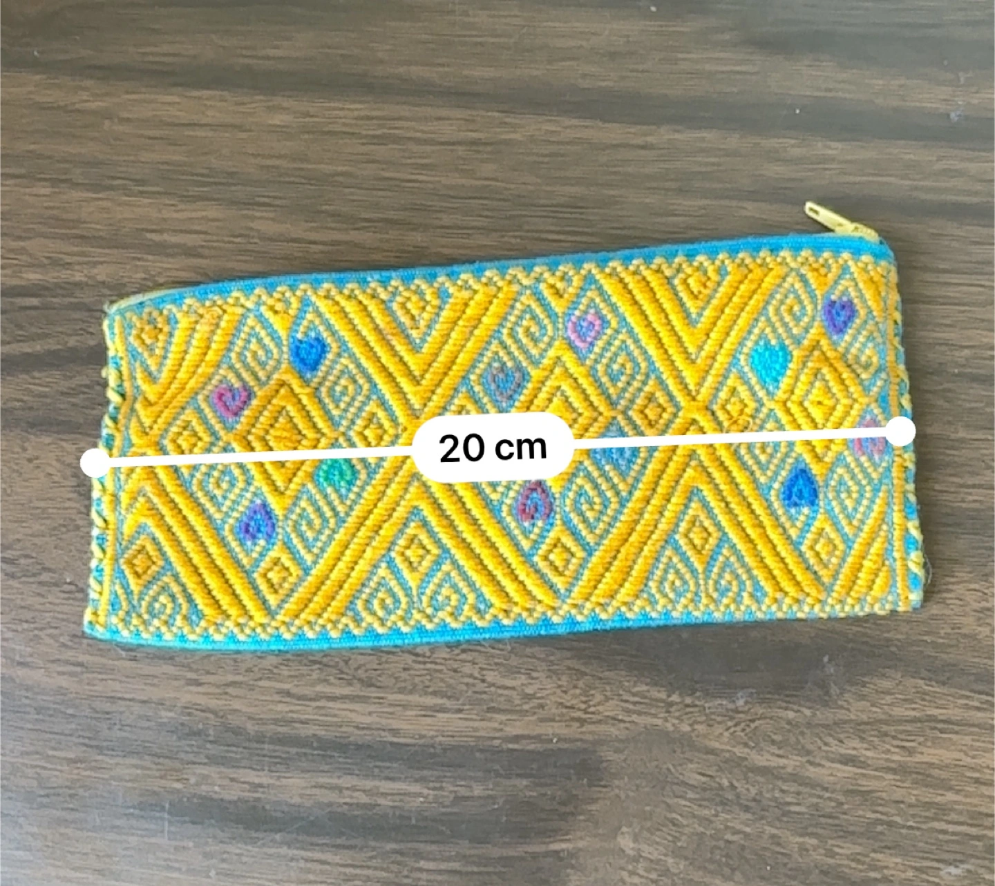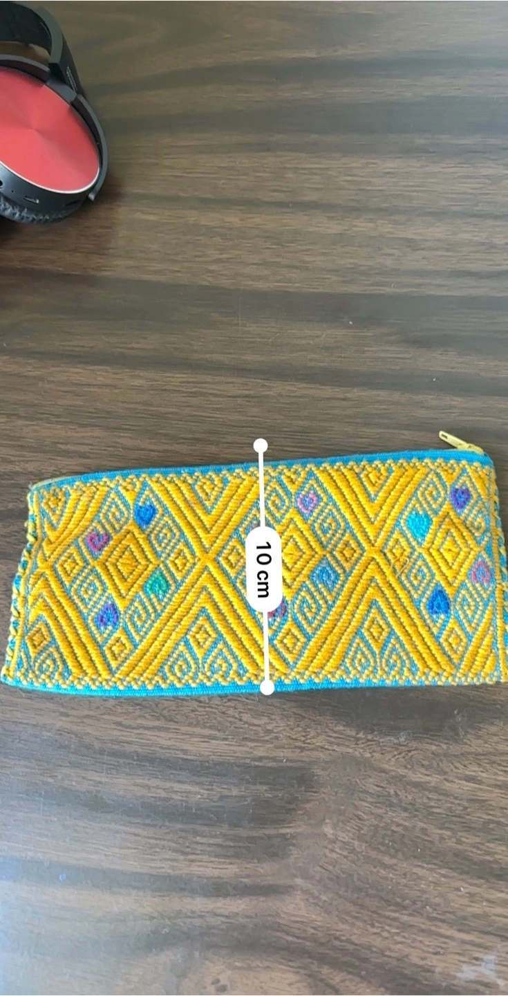 I'm selling this unique, handmade pouch! It features a beautiful woven pattern in yellow and blue. It's about 20cm long and 10cm wide, perfect for storing small items.
