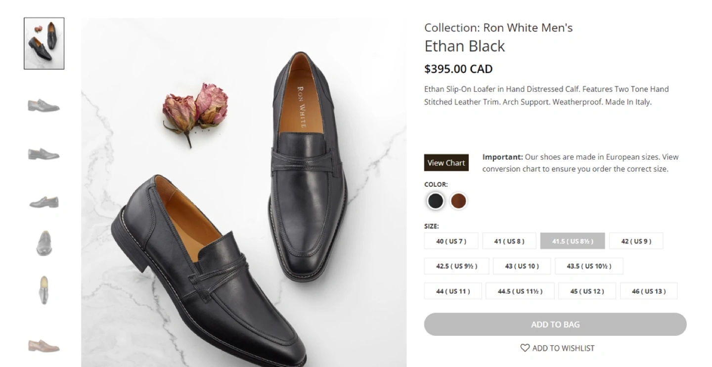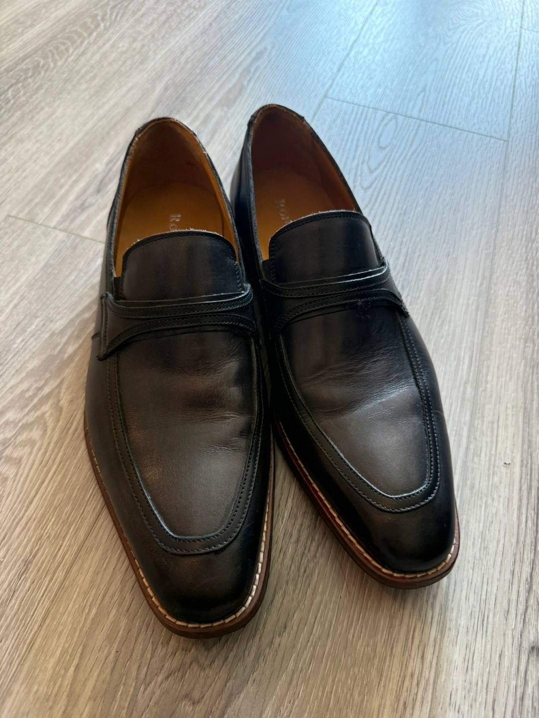 These are Ron White Ethan slip-on loafers in size US 8.5. They're made of hand-distressed leather and feature two-tone hand-stitched leather trim. The shoes are weatherproof and made in Italy. Retails for $395 CAD