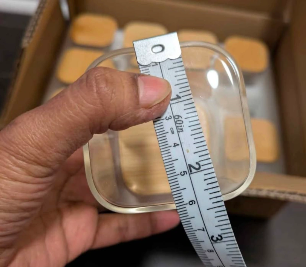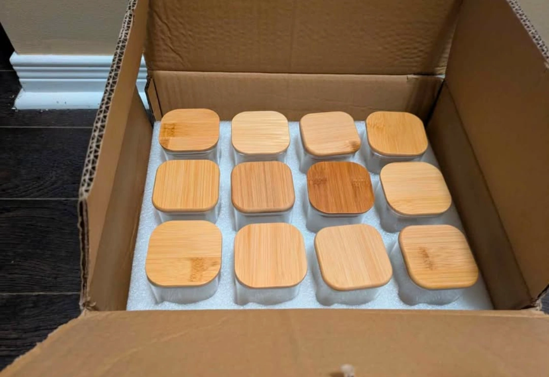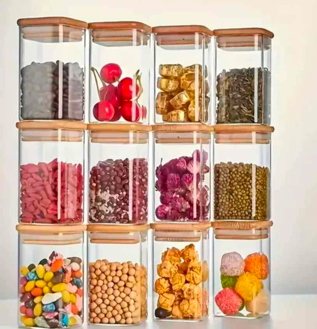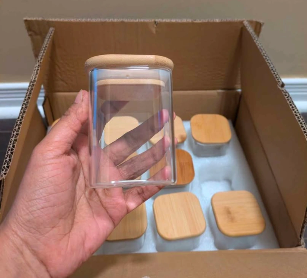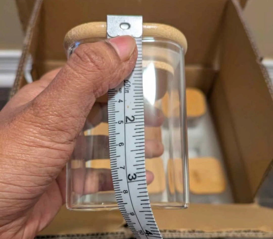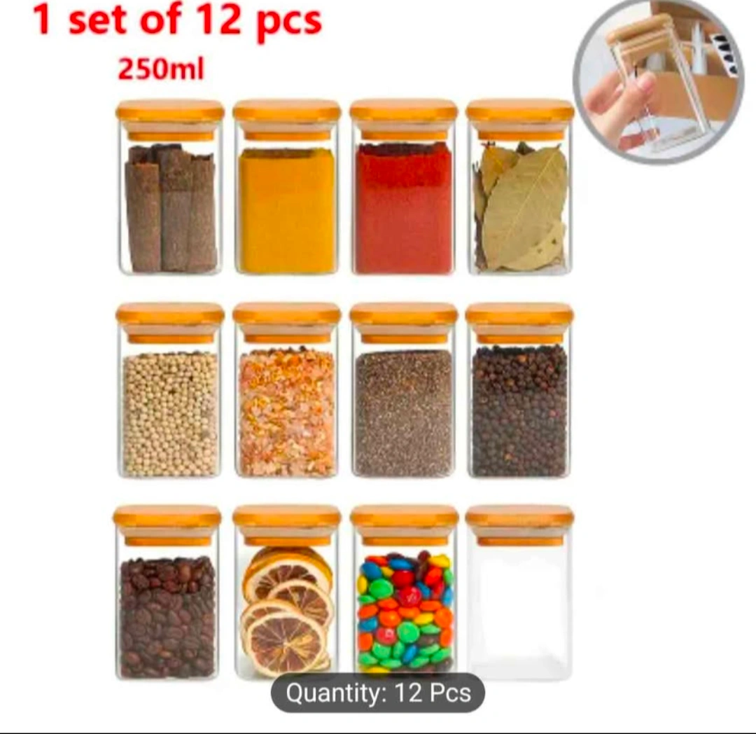 46I have a set of 12 glass jars with bamboo lids available! They're perfect for organizing your pantry or storing small items around the house. The jars are clear glass with a natural bamboo lid. The size is approximately 3 inches tall and 2.5 inches wide. They come in the original box, so they're easy to transport cash only