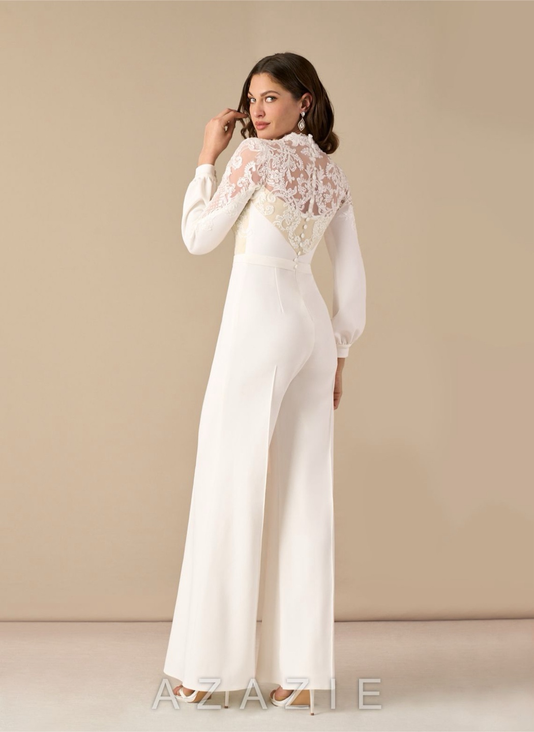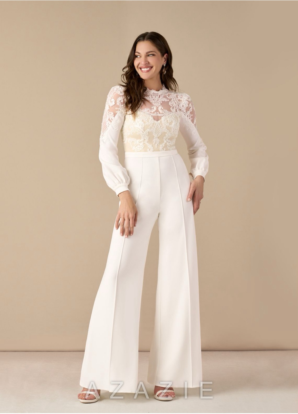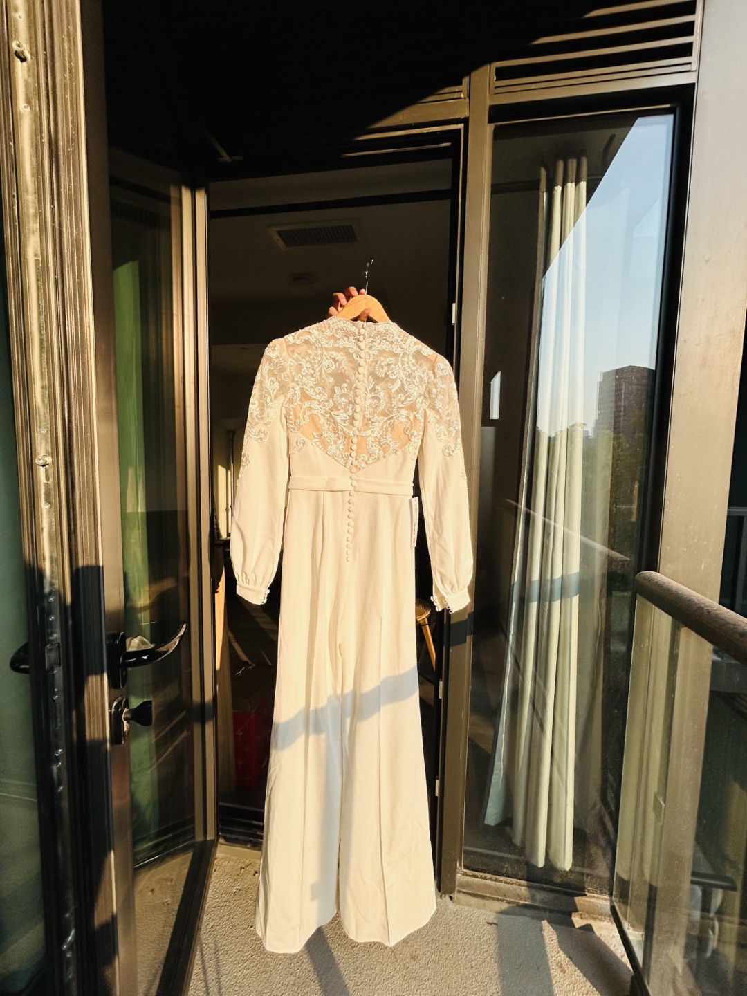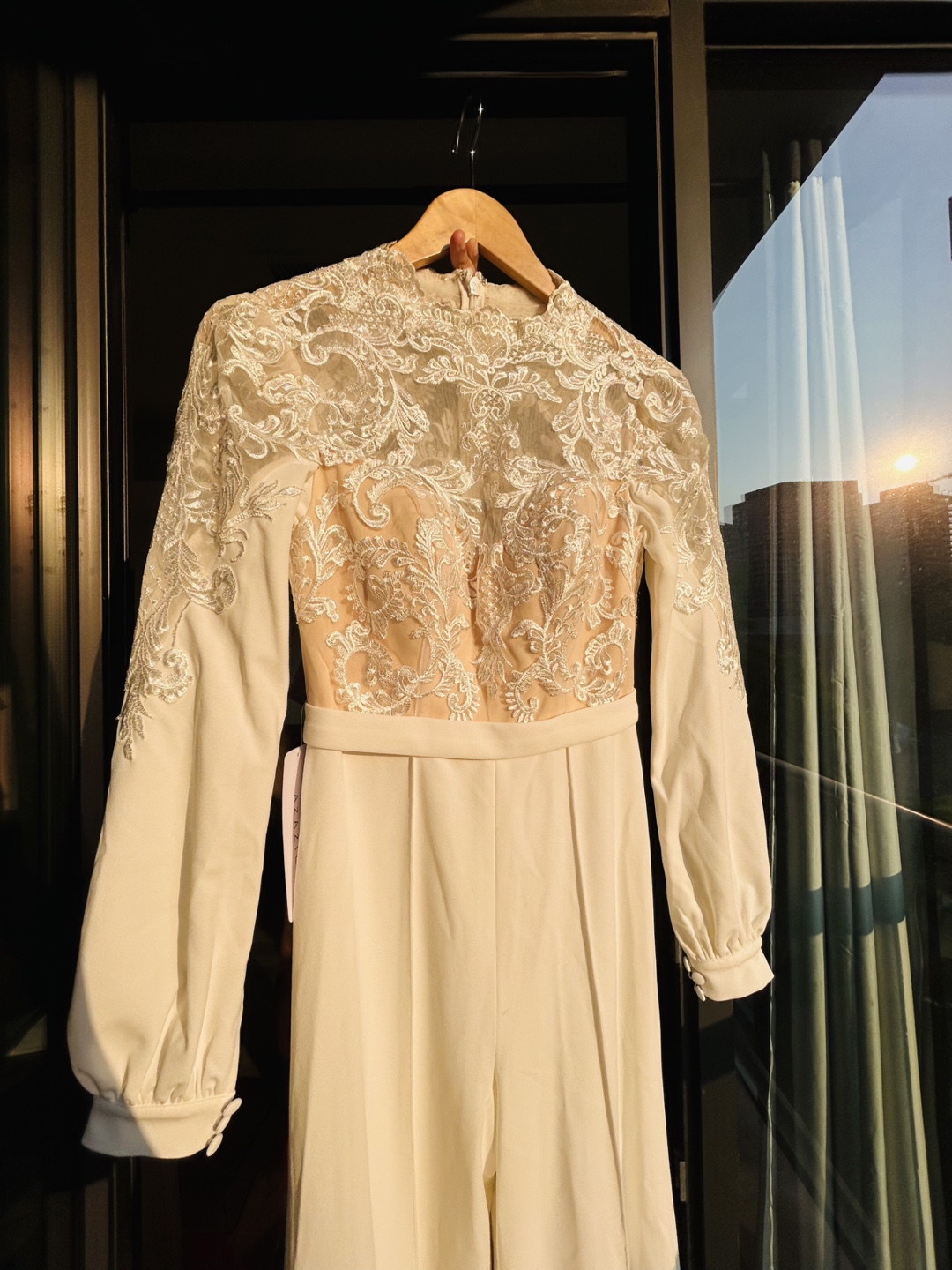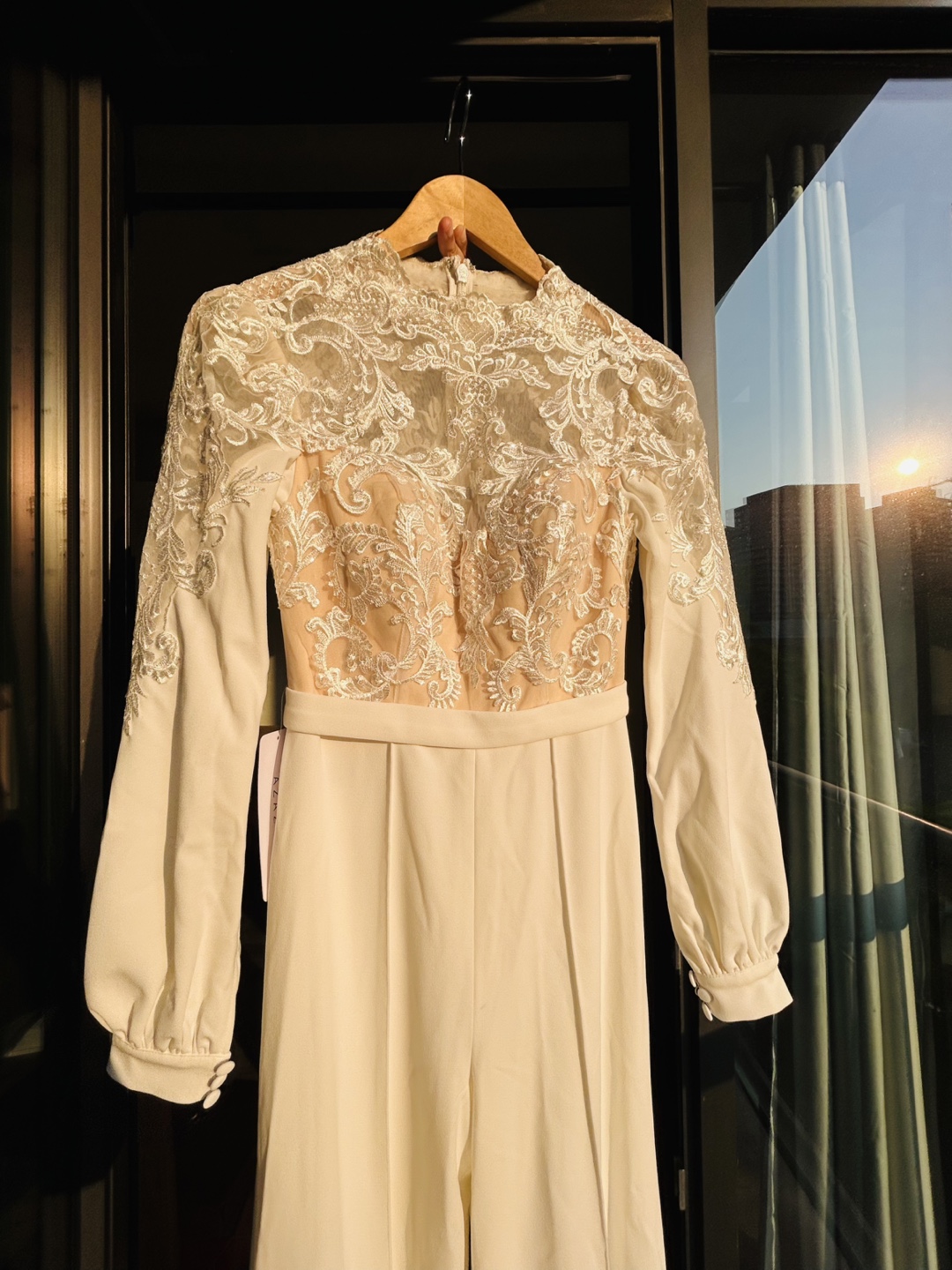 Selling a beautiful white lace wedding jumpsuit. Perfect for a modern bride. The lace detailing is stunning, and the wide-leg pants are super flattering. It was never worn as I got another gown. Still has the tag on it.