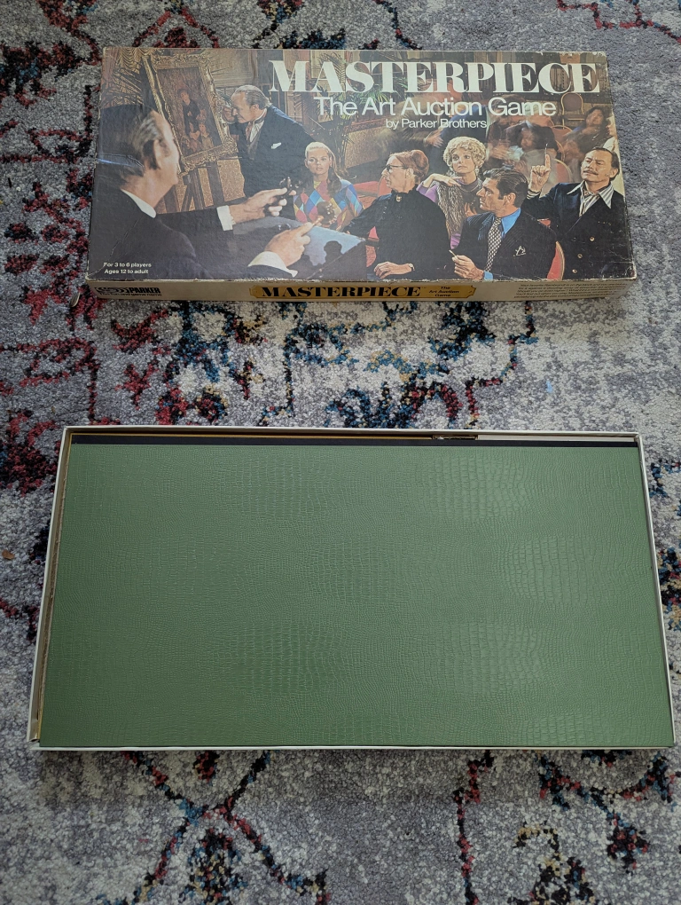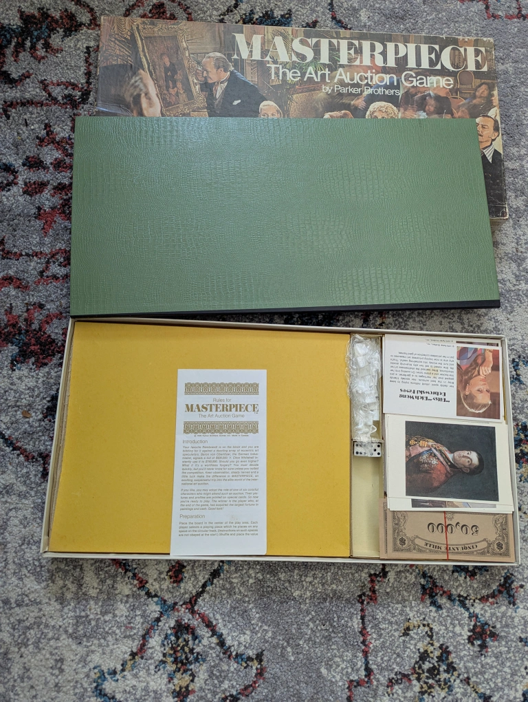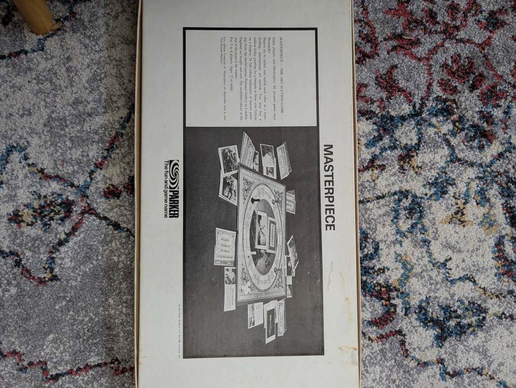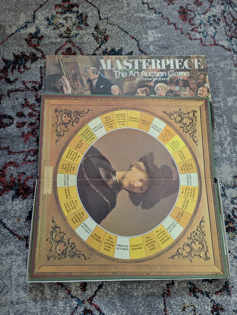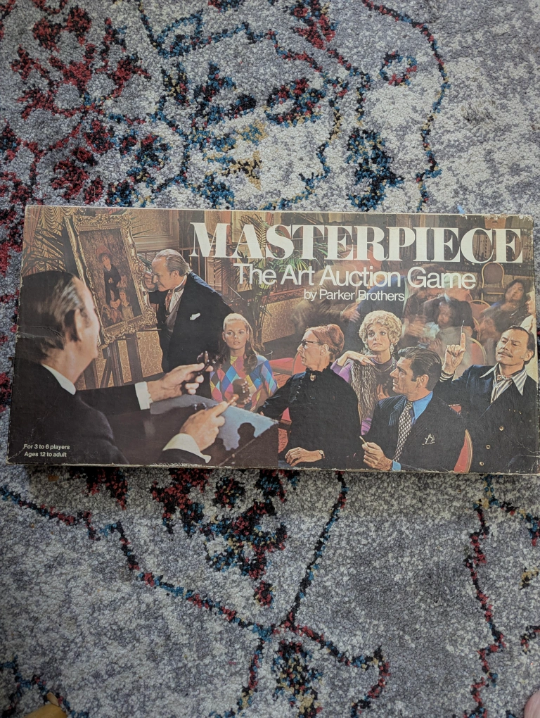 Selling a vintage copy of Masterpiece: The Art Auction Game by Parker Brothers! It's a fun game for 3 to 6 players, ages 12 to adult. The box is included and contains all the pieces needed to play