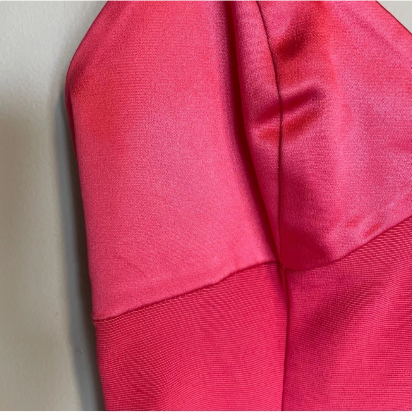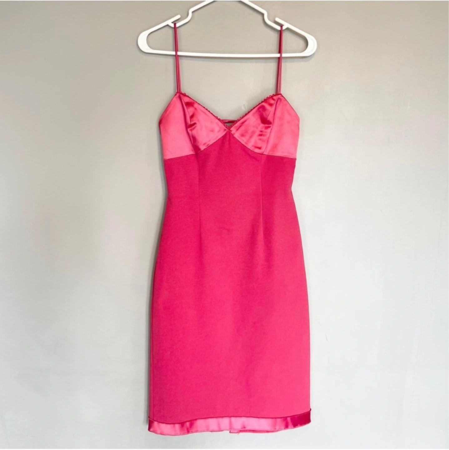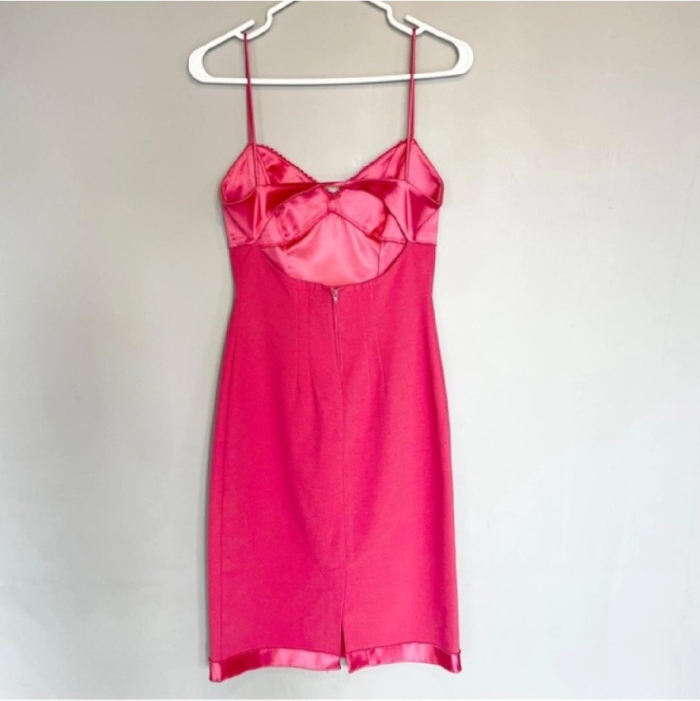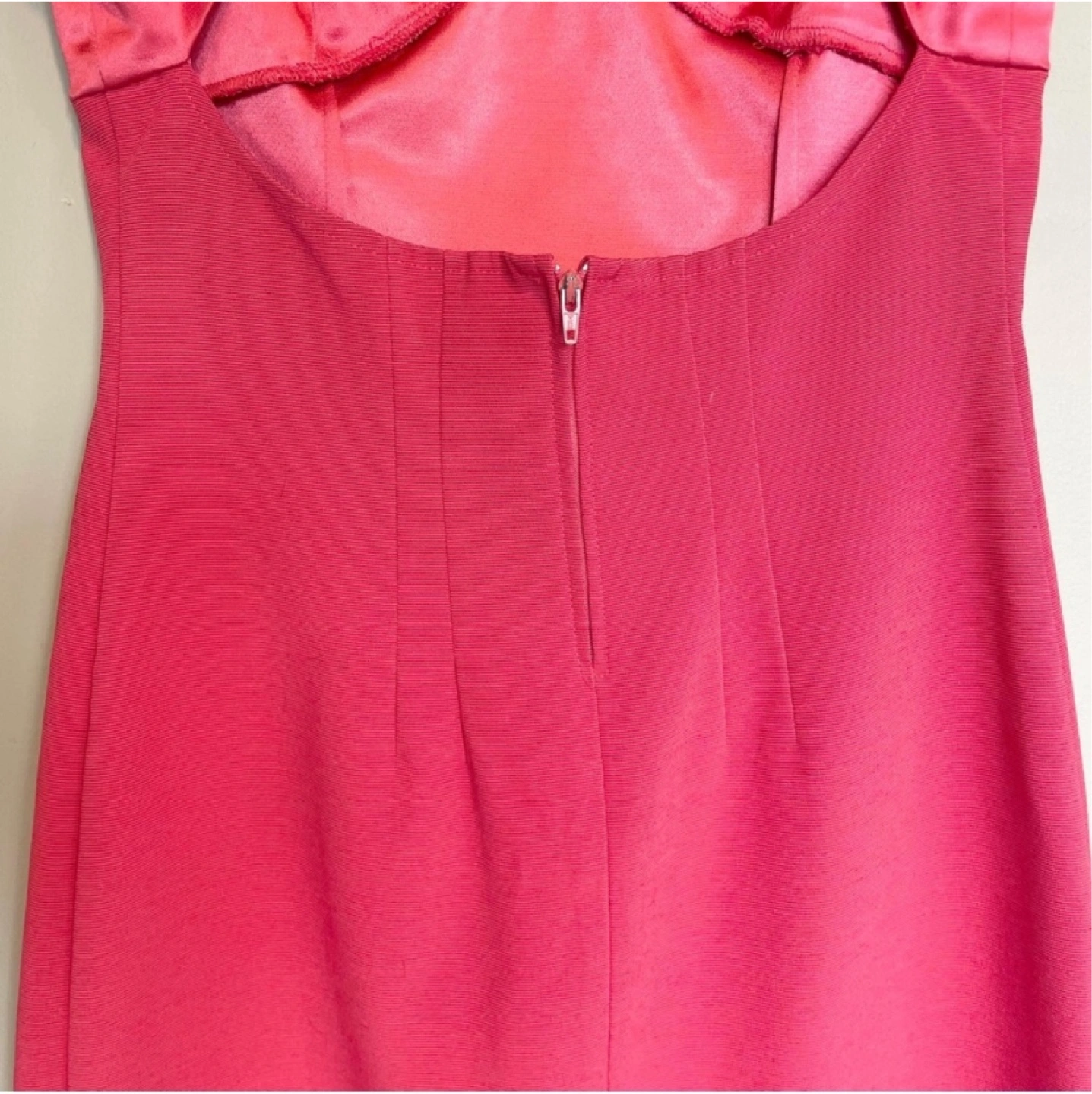 Hot pink structured dress with satin accents, open cut out back, and scalloped hem on bust