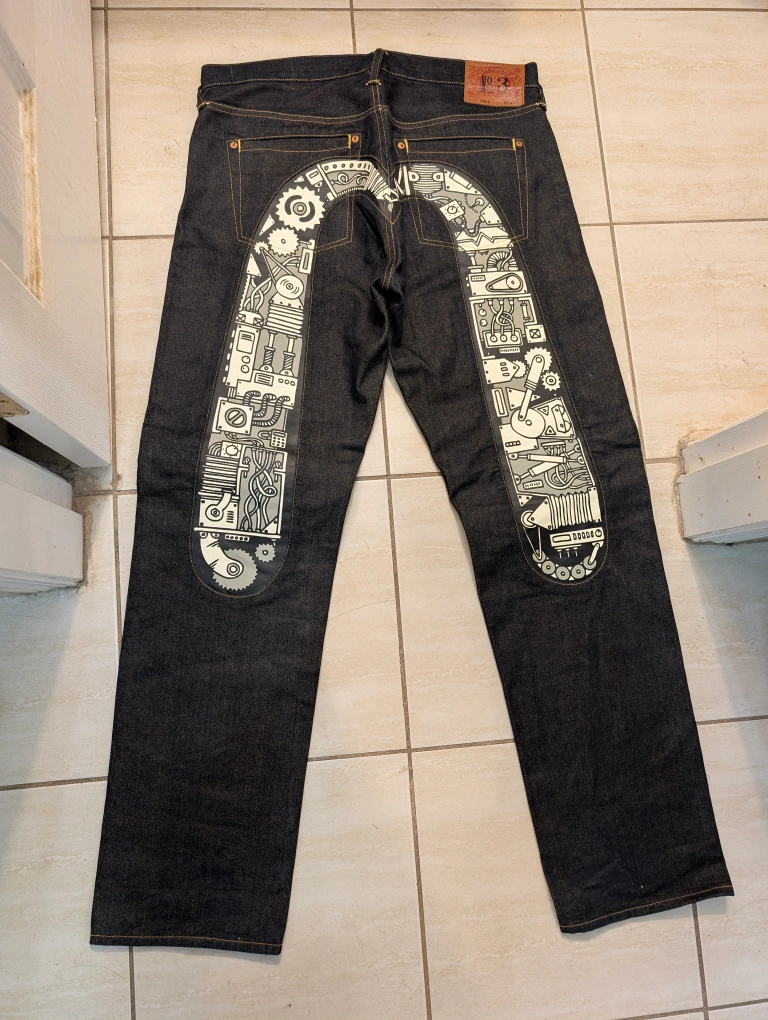Selling a pair of Evisu jeans in size 34x34! They have a unique design on the back pockets, and are in brand new great condition.