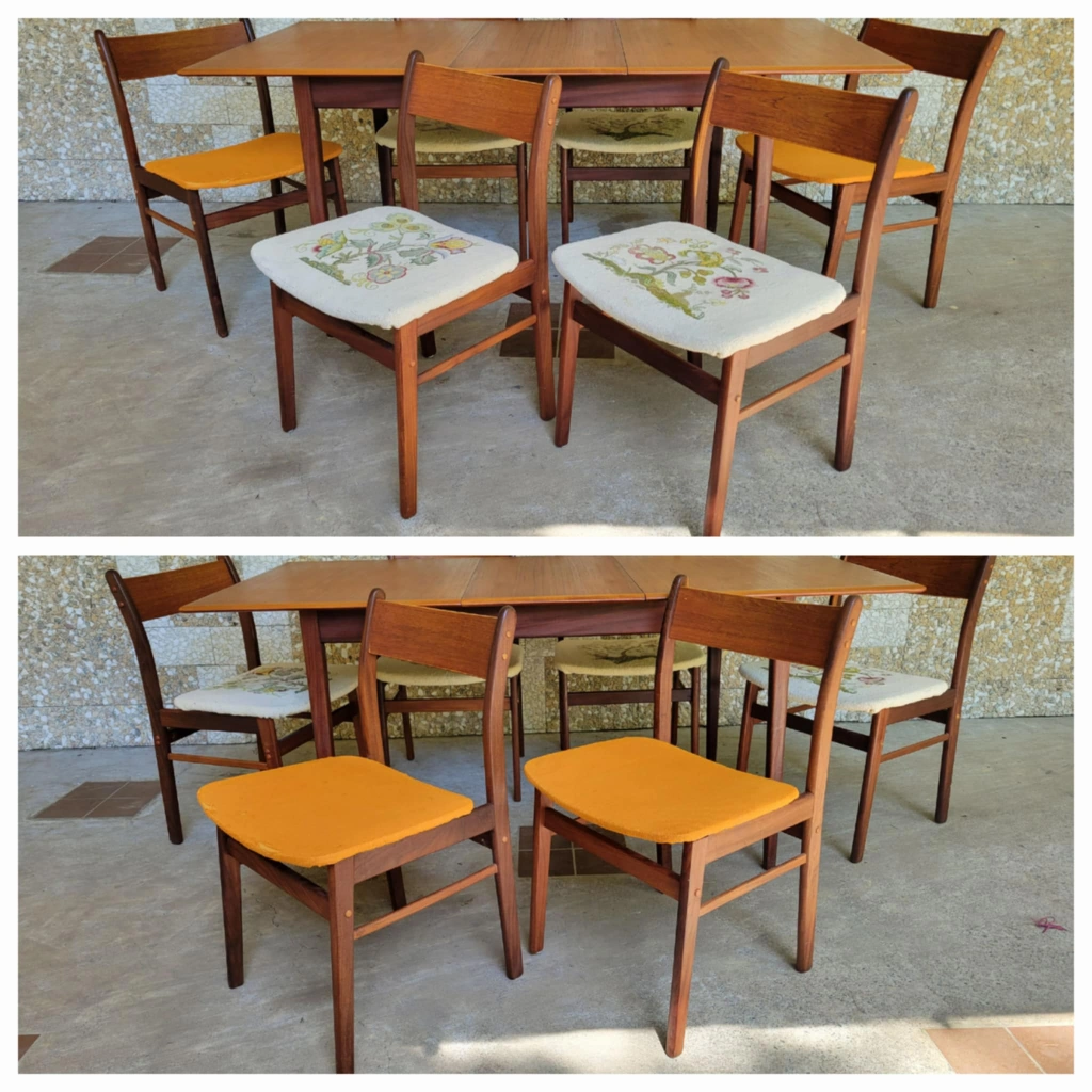Mid century solid teak dining chairs with beige embroided seat covers and original orange upholstery below on all chairs. Total of four remaining (2 and 2)