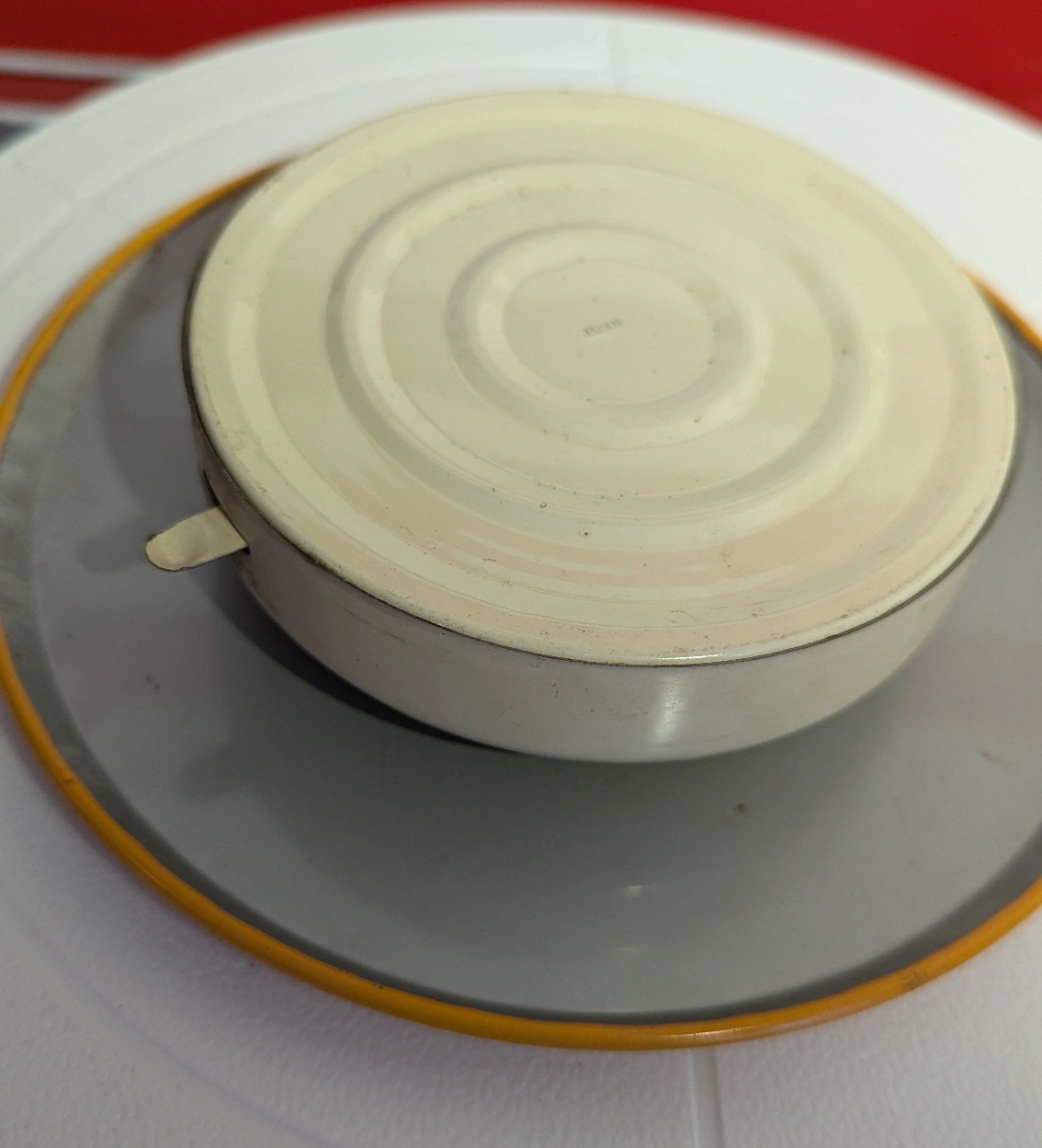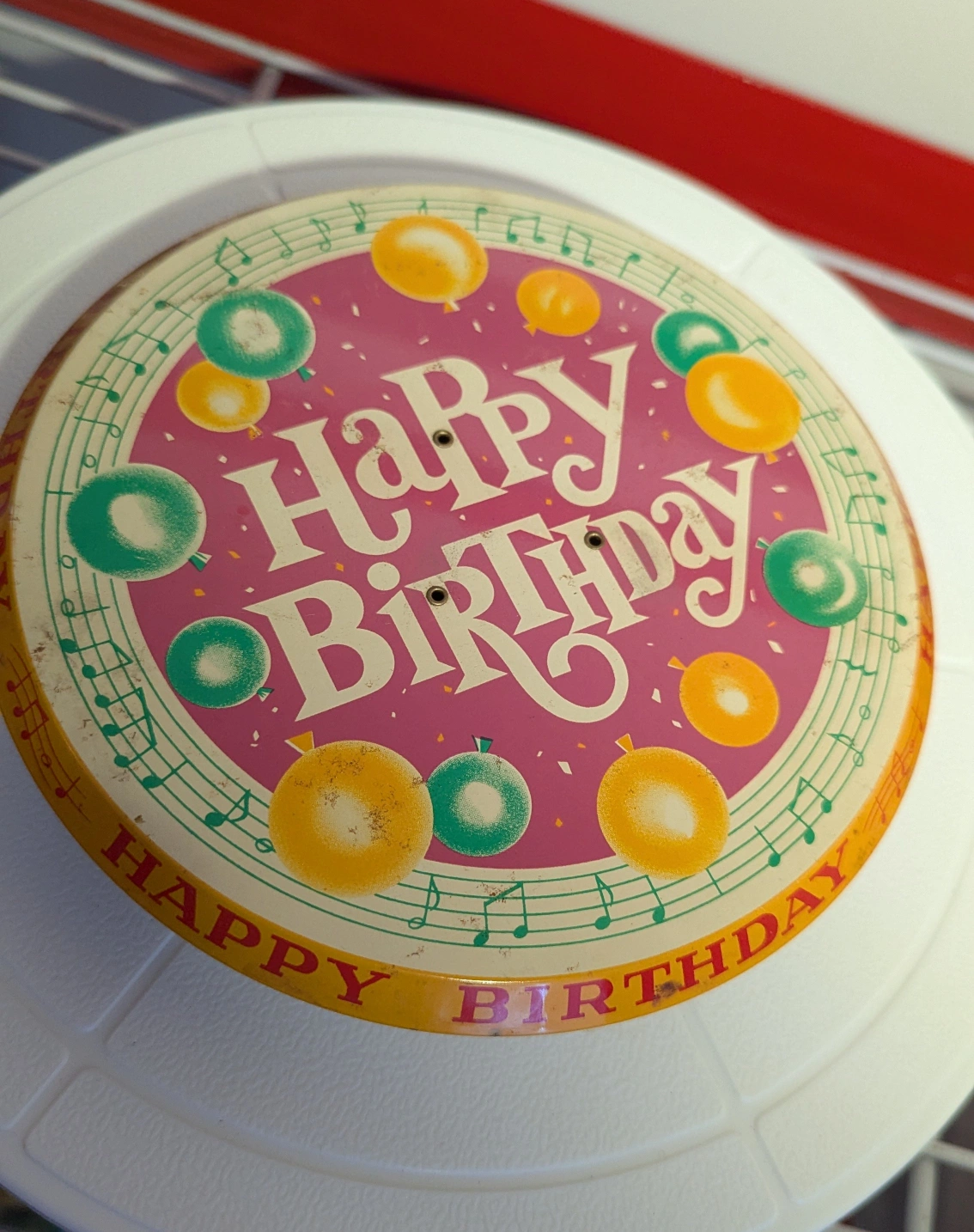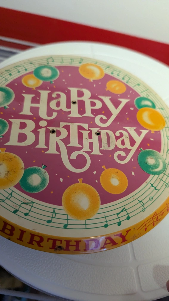 Selling a vintage musical cake tin with a "Happy Birthday" theme. It plays music when you wind it up. It's perfect for adding a nostalgic touch to your birthday celebrations! 7 inches across