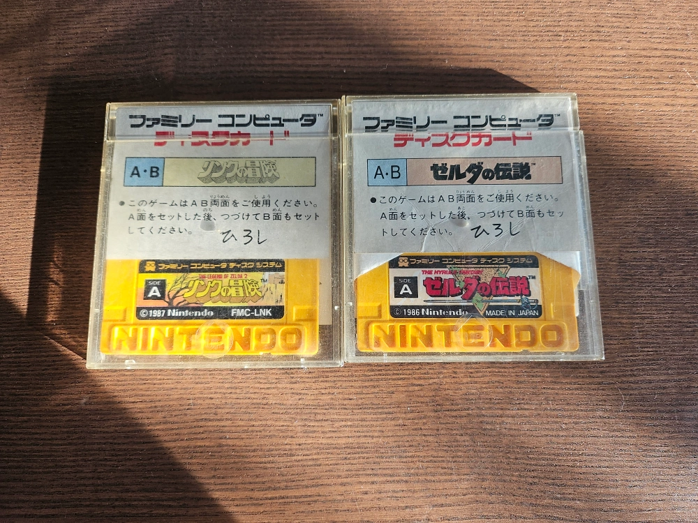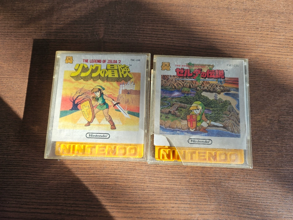 Selling two Nintendo Famicom Disk System games: The Legend of Zelda and The Legend of Zelda 2: The Adventure of Link! Note broken corner but otherwise good shape.