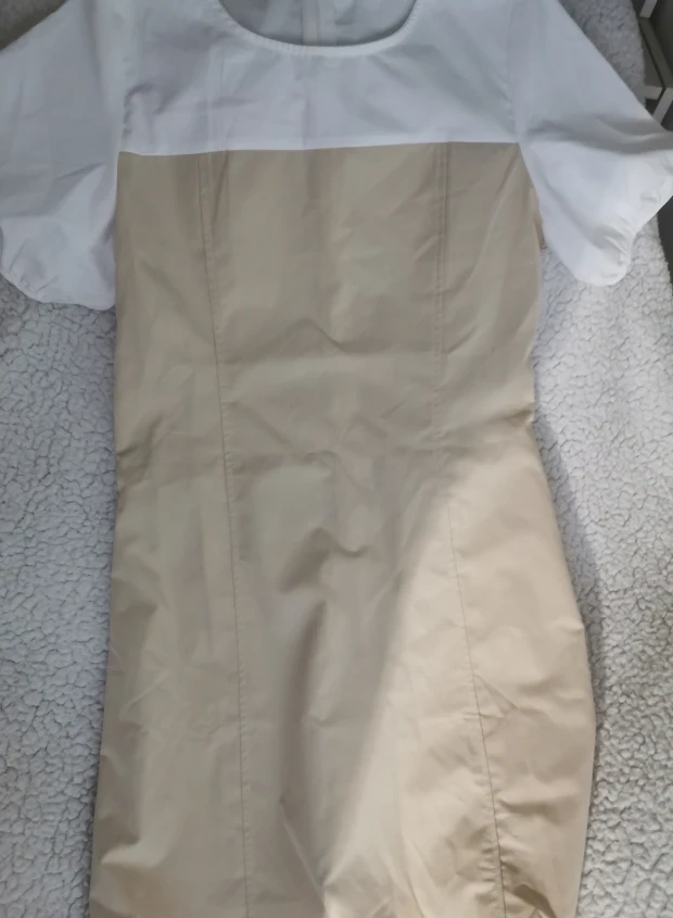A cute dress with a beige bottom and white top. It's in good condition and would be perfect for spring or summer!