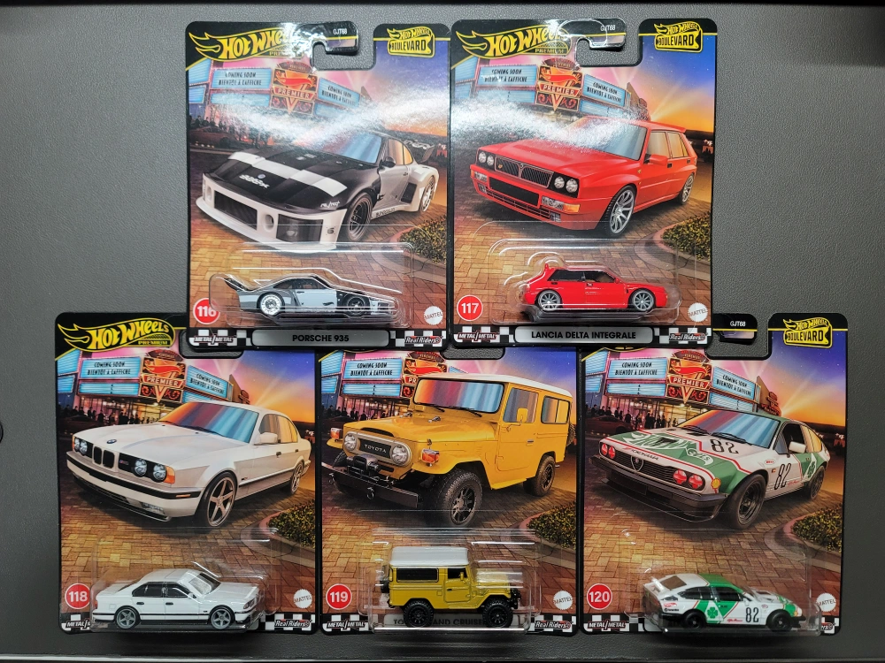 39I have a collection of Hot Wheels Boulevard series diecast cars for sale! These are all new in their original packaging. Includes Porsche 935, Lancia Delta Integrale, Toyota Land Cruiser and more! Great for collectors or kids who love cars