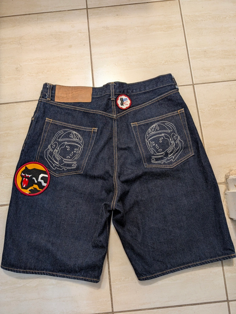 Selling a pair of Billionaire Boys Club denim shorts. They're a size 36 and feature cool patches and embroidery on the front and back. Great for adding some unique style to your wardrobe!