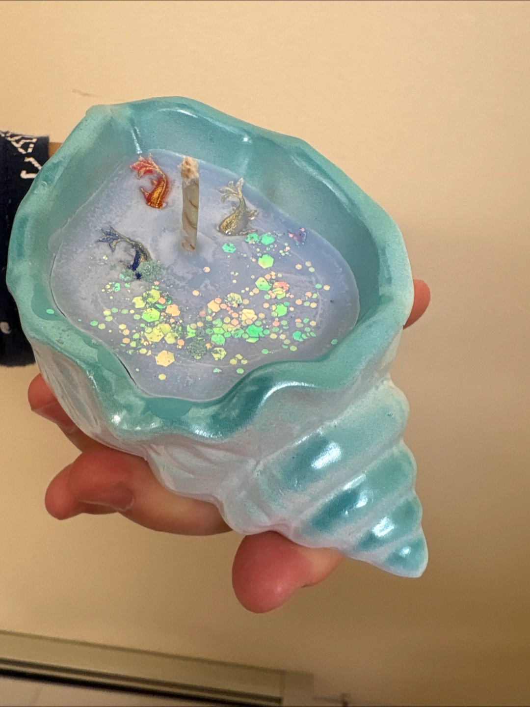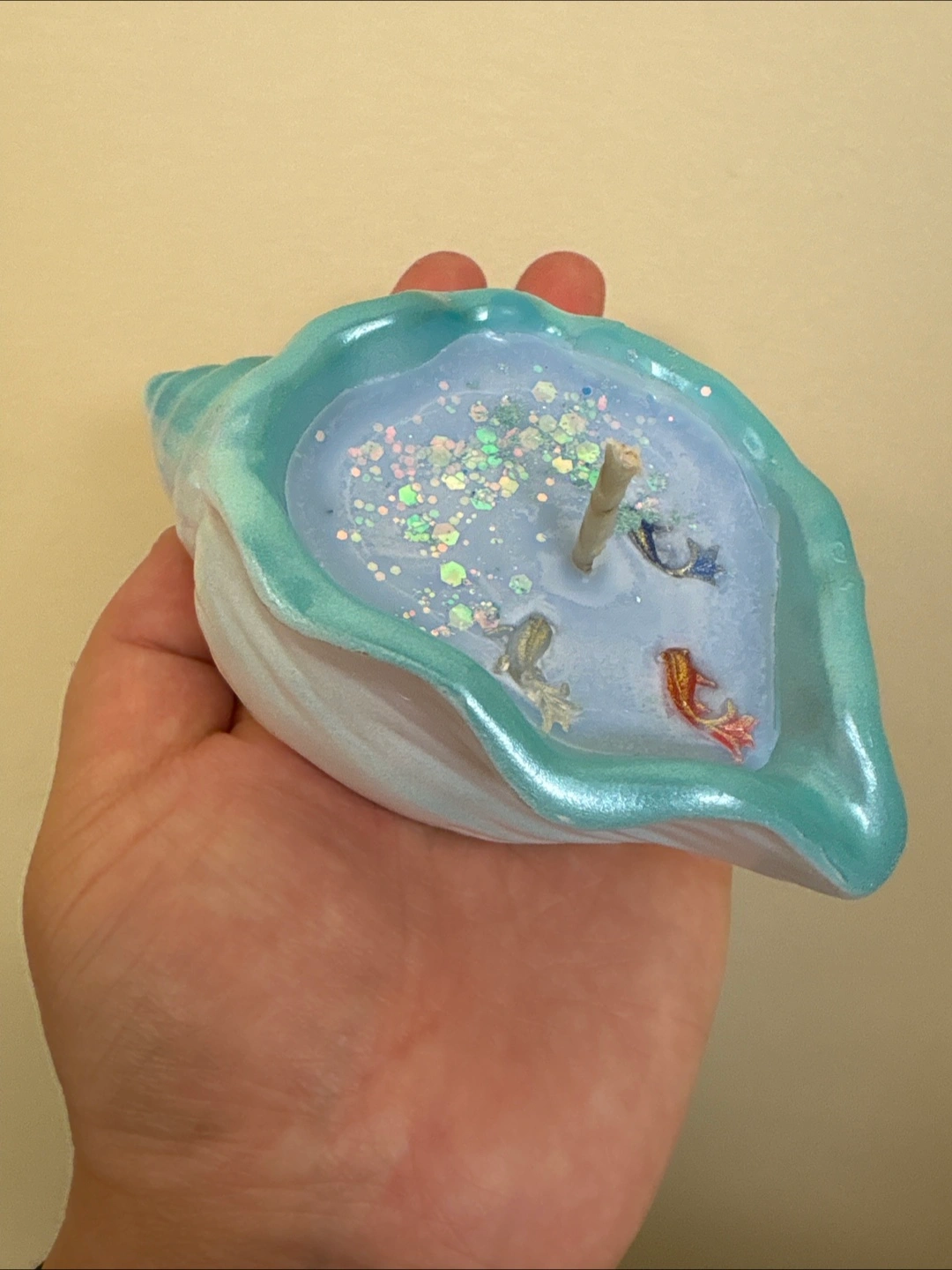 I'm selling self-made ocean breeze scene shell candles! Some small fishes swimming in the water with beautiful glitter as a final touch.