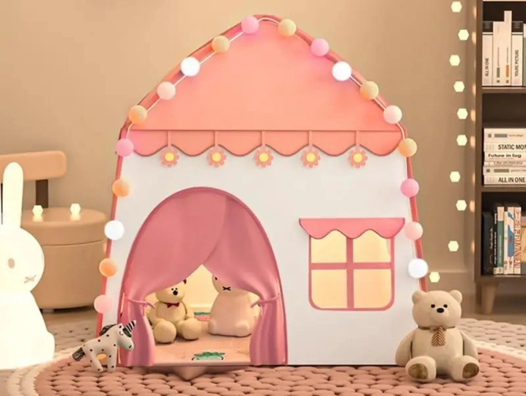 A cute pink and white play tent for kids! It's in great condition and perfect for indoor fun.