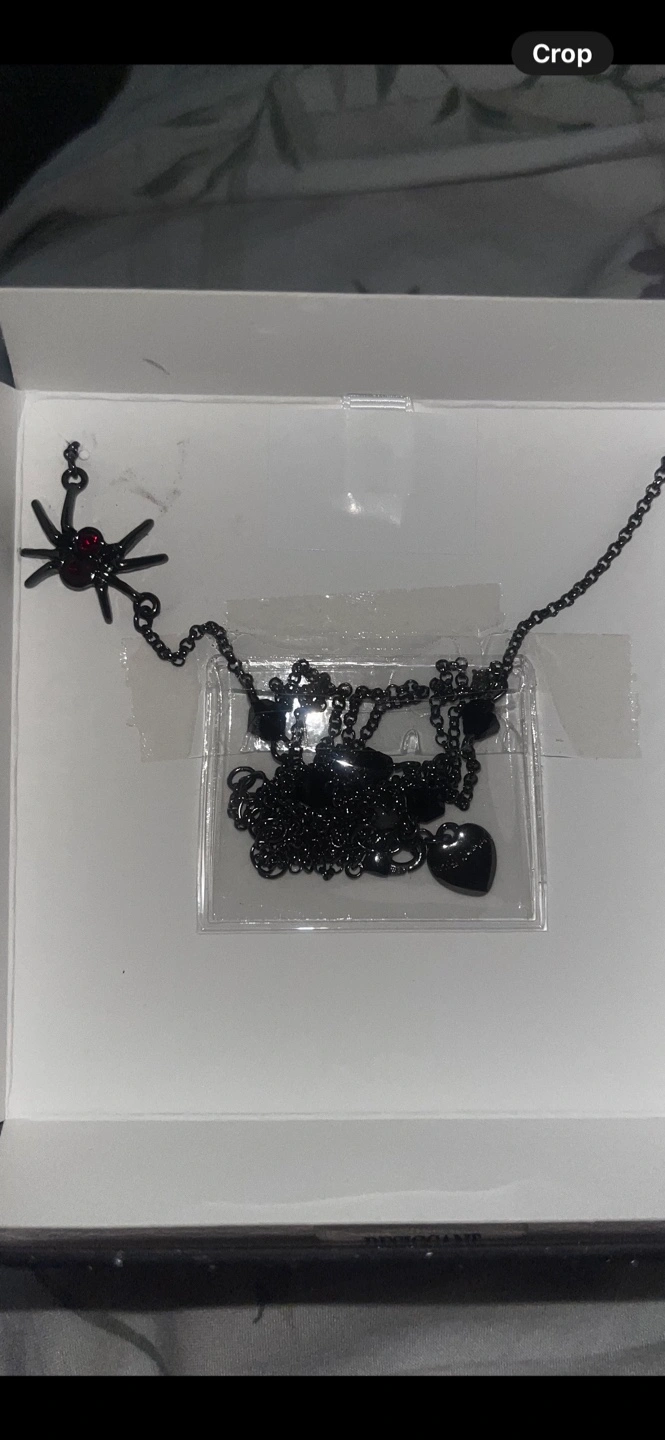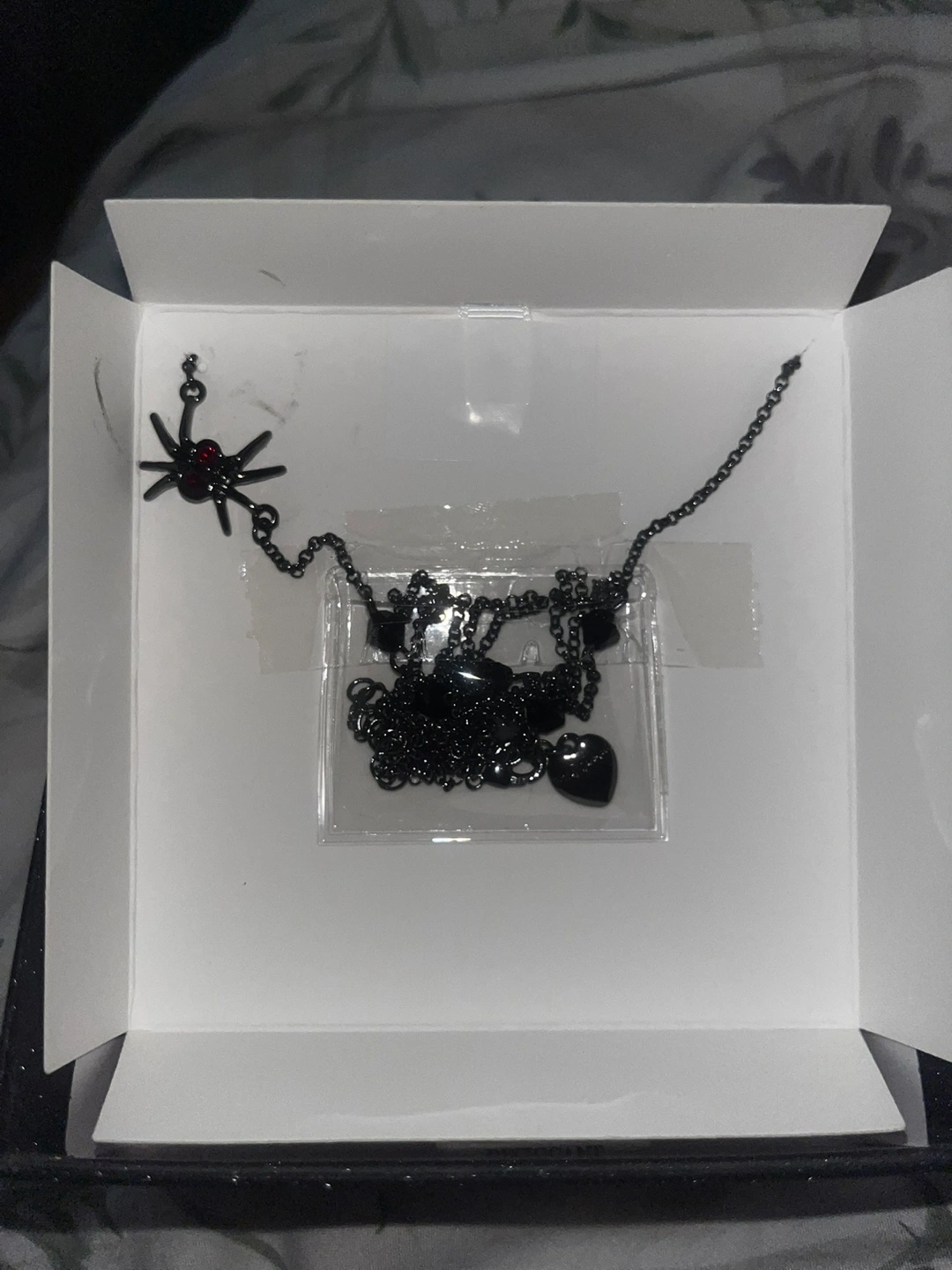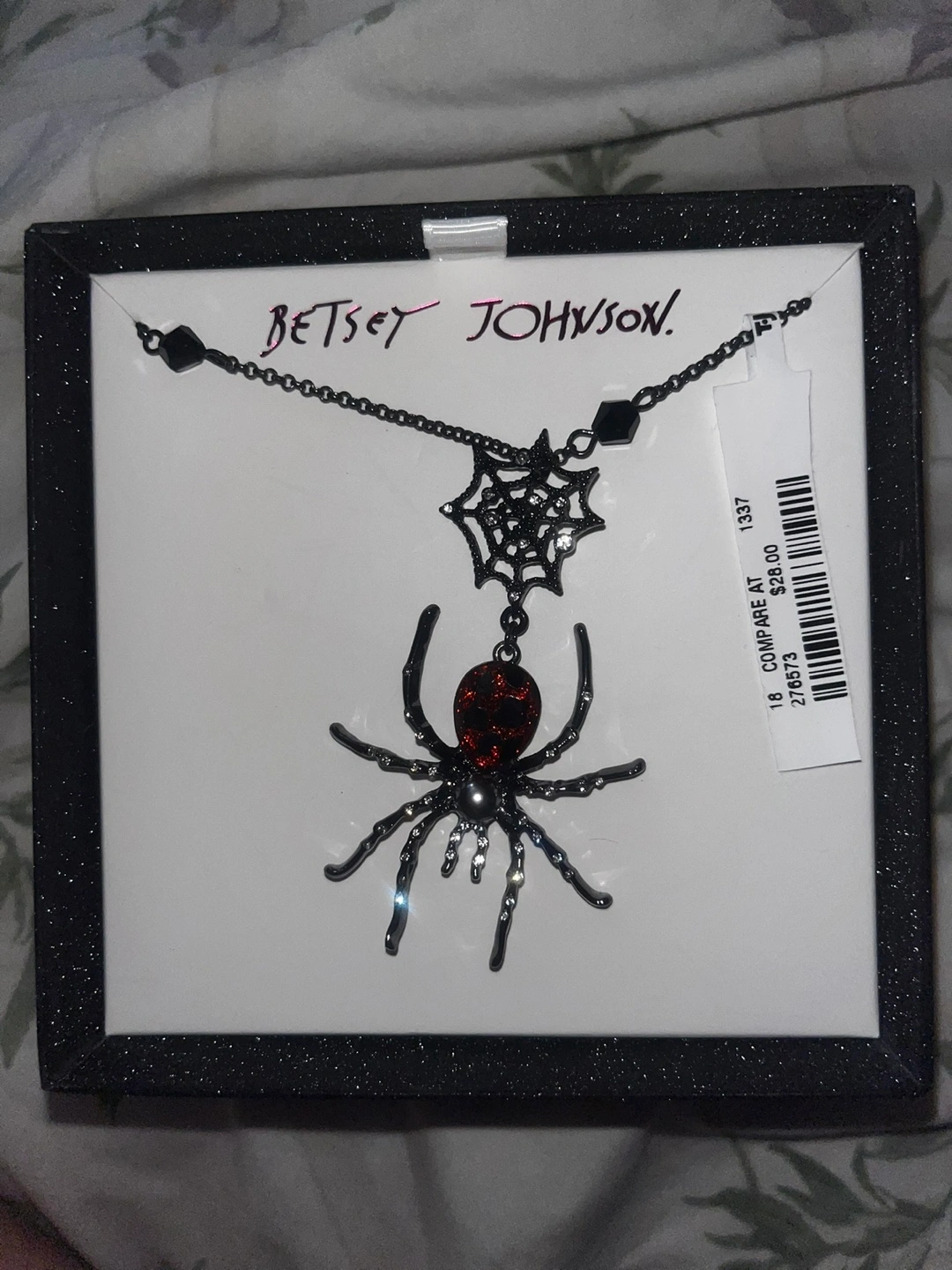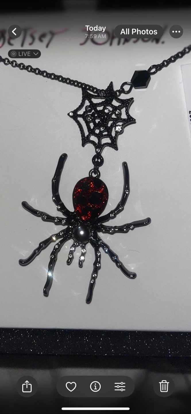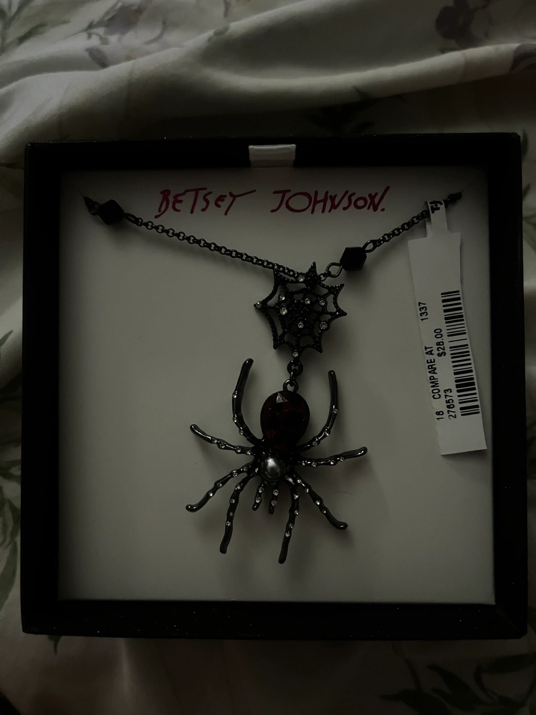 This Betsey Johnson necklace is brand new and comes in its original box! It features a spider and spiderweb design. The tag shows it originally retailed for $28. It's a unique and eye-catching piece!