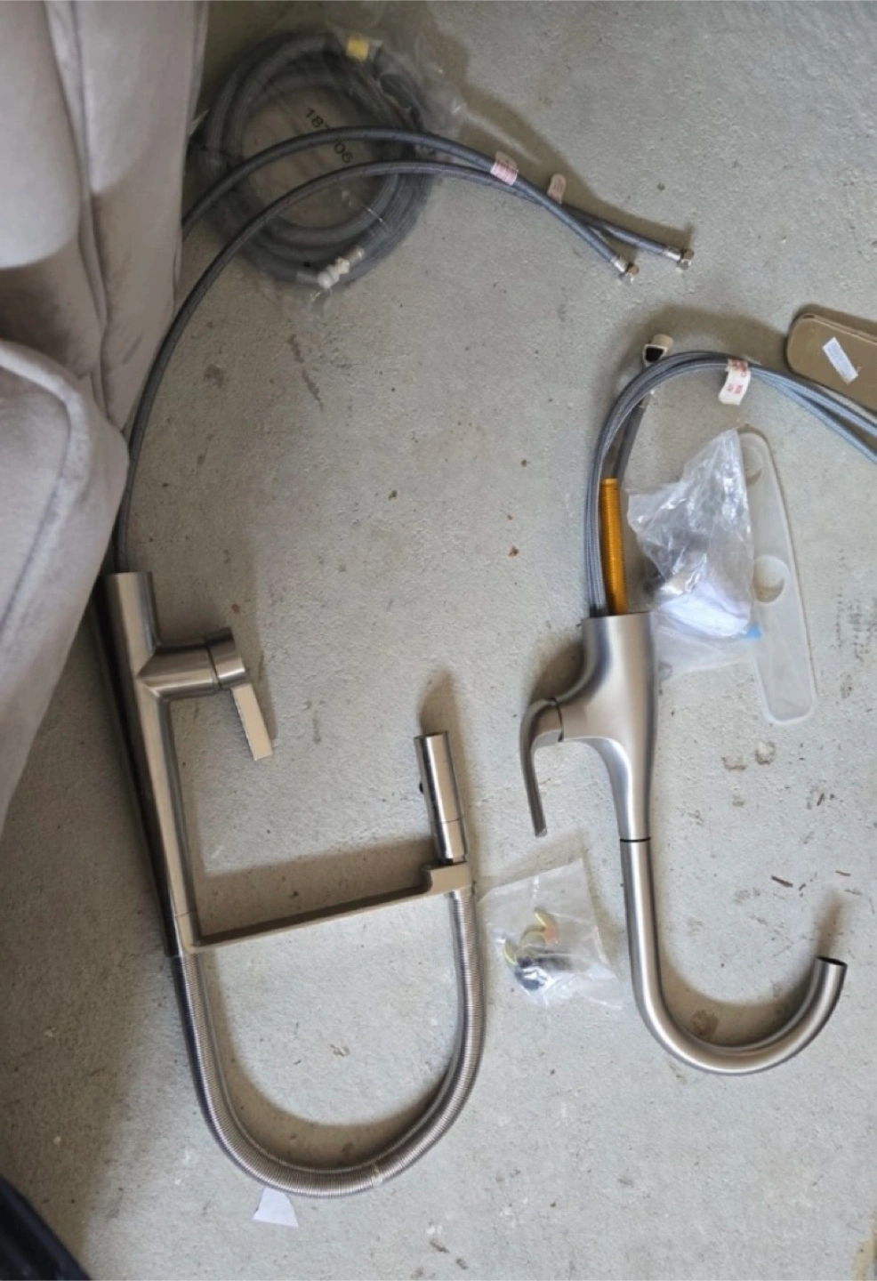 Selling a kitchen faucet set in silver colour. It looks to be in good condition and comes with the hoses and mounting hardware