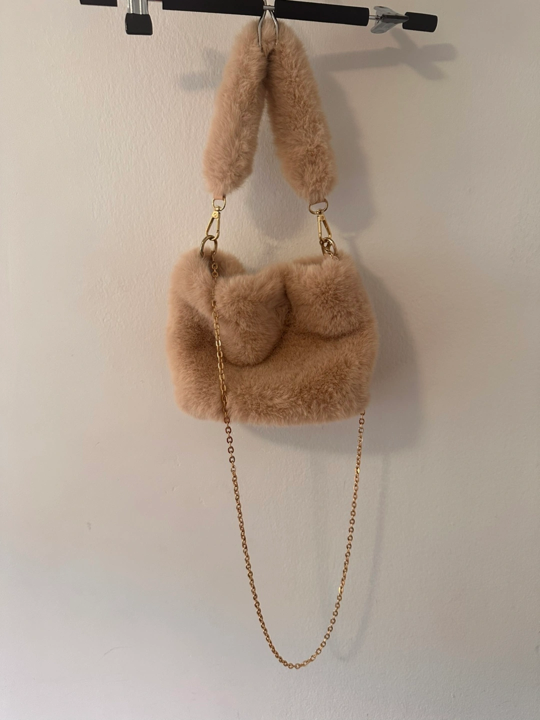 89Selling a cute faux fur shoulder bag! It's a soft, beige colour and in great condition. Perfect for adding a touch of cozy style to any outfit. Has a gold chain detail as well!
