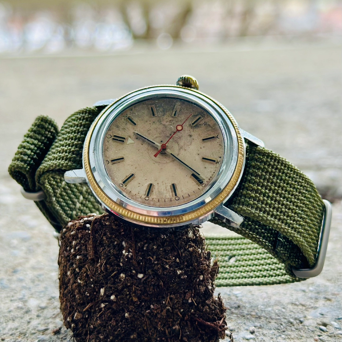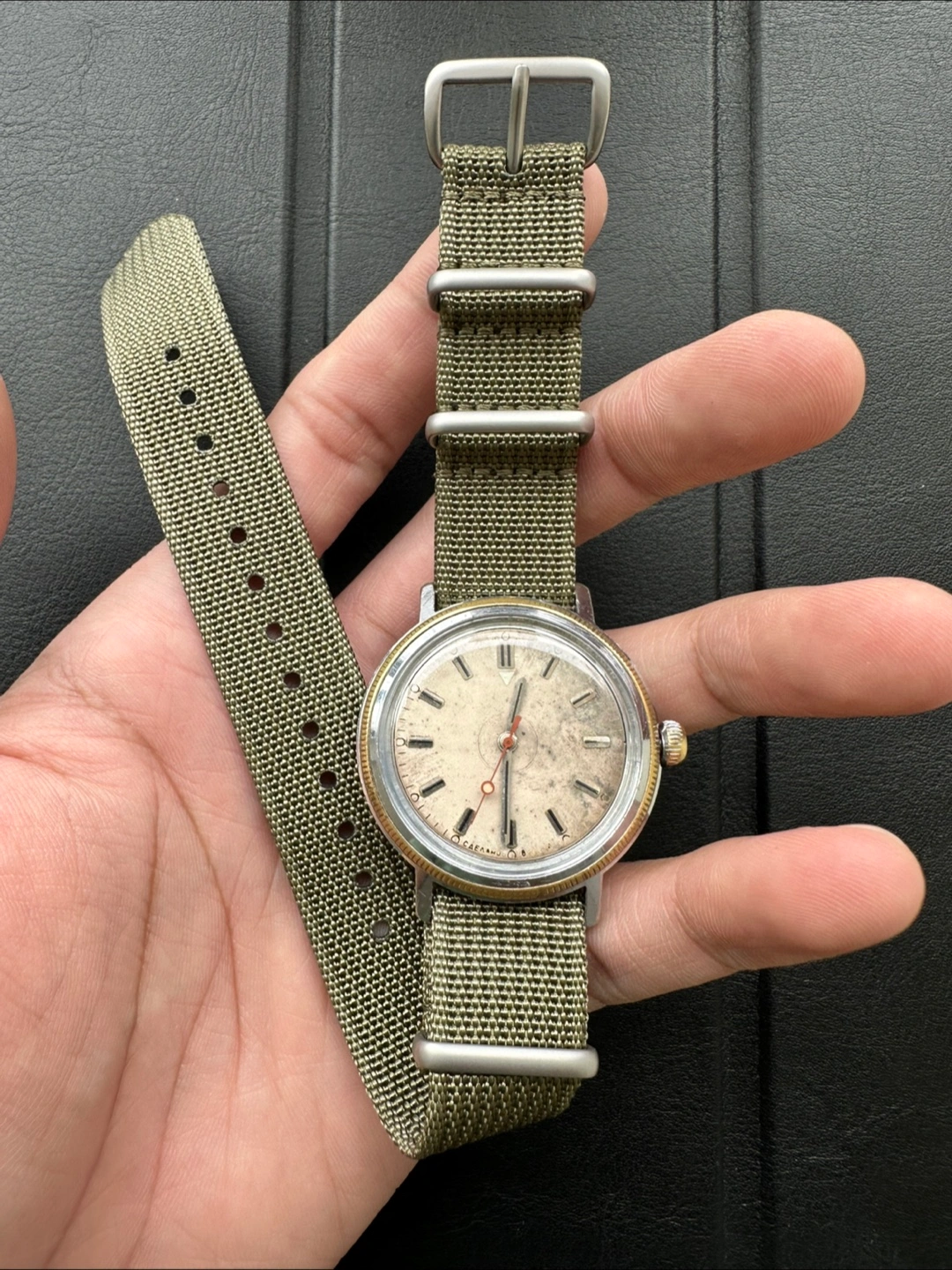 Two-tone stainless steel case and Military Green NATO strap.
