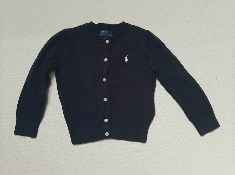 A cute Polo Ralph Lauren cardigan in size 3/3T. It's a classic cable knit design in a navy colour. Made from 100% cotton, it's soft and comfy for your little one!