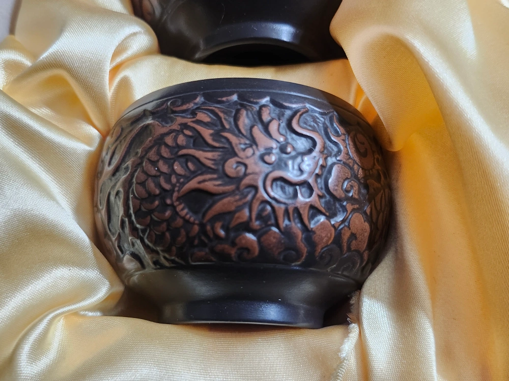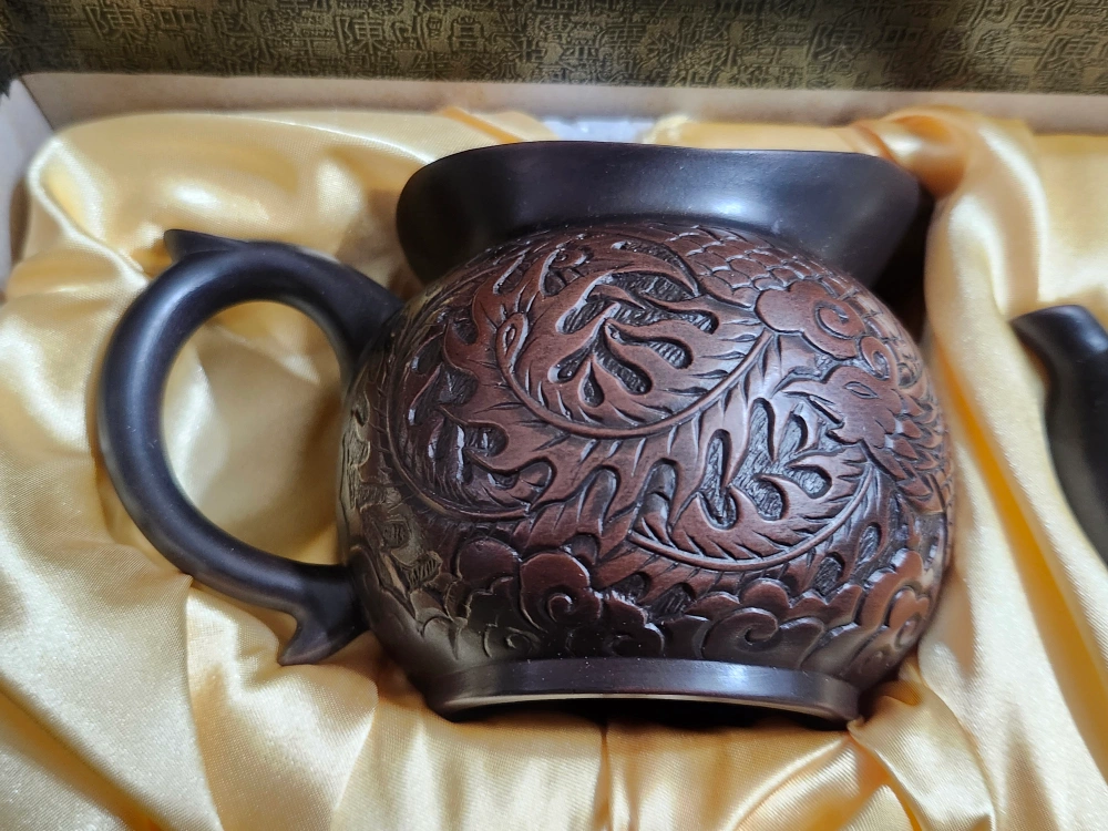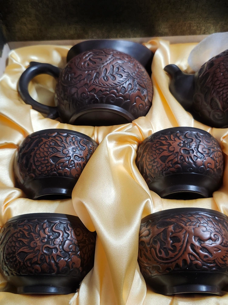 This is a brand new tea set with a beautiful dragon carving design. It comes in its original box, making it a perfect gift or a lovely addition to your tea collection.