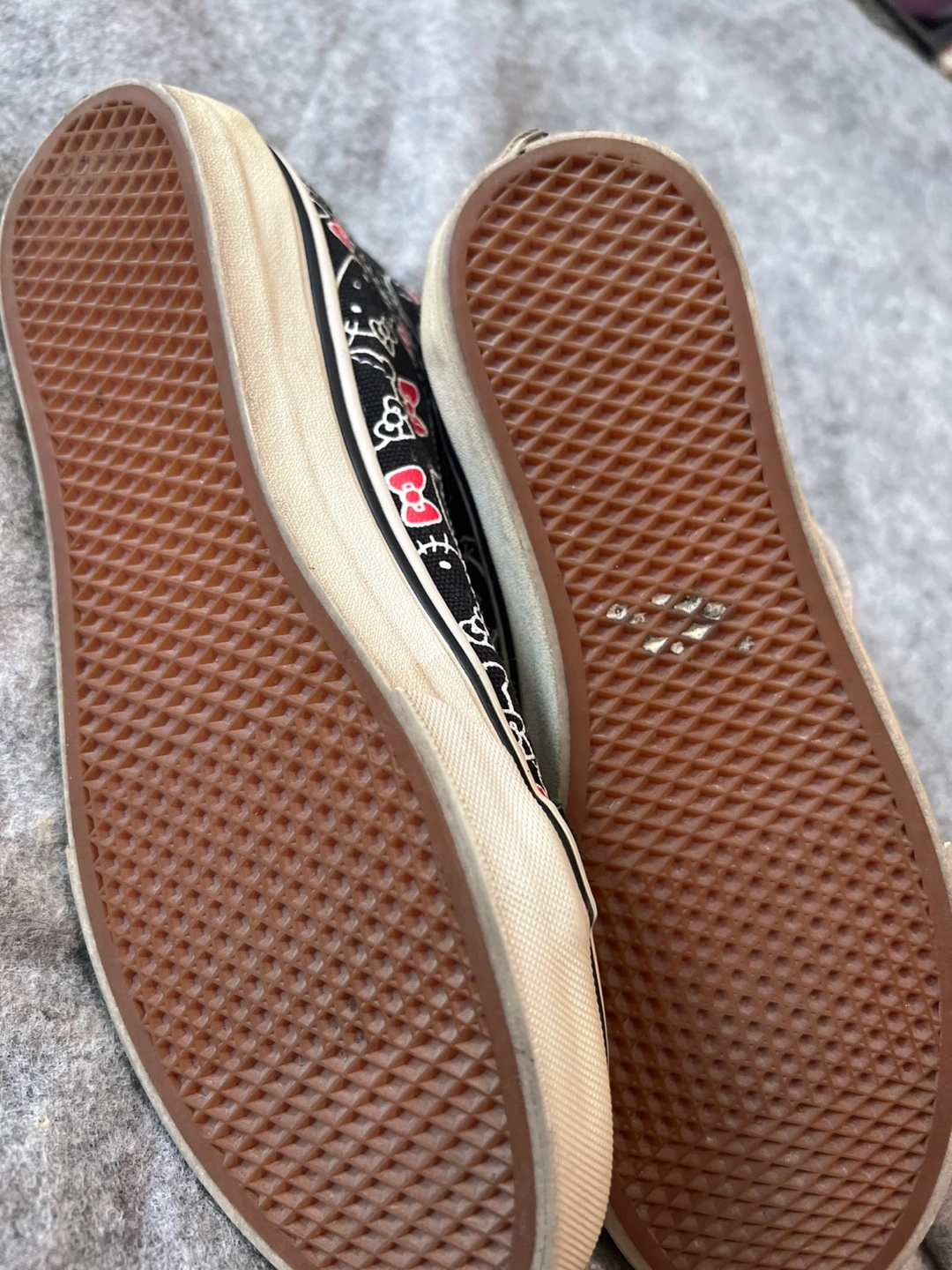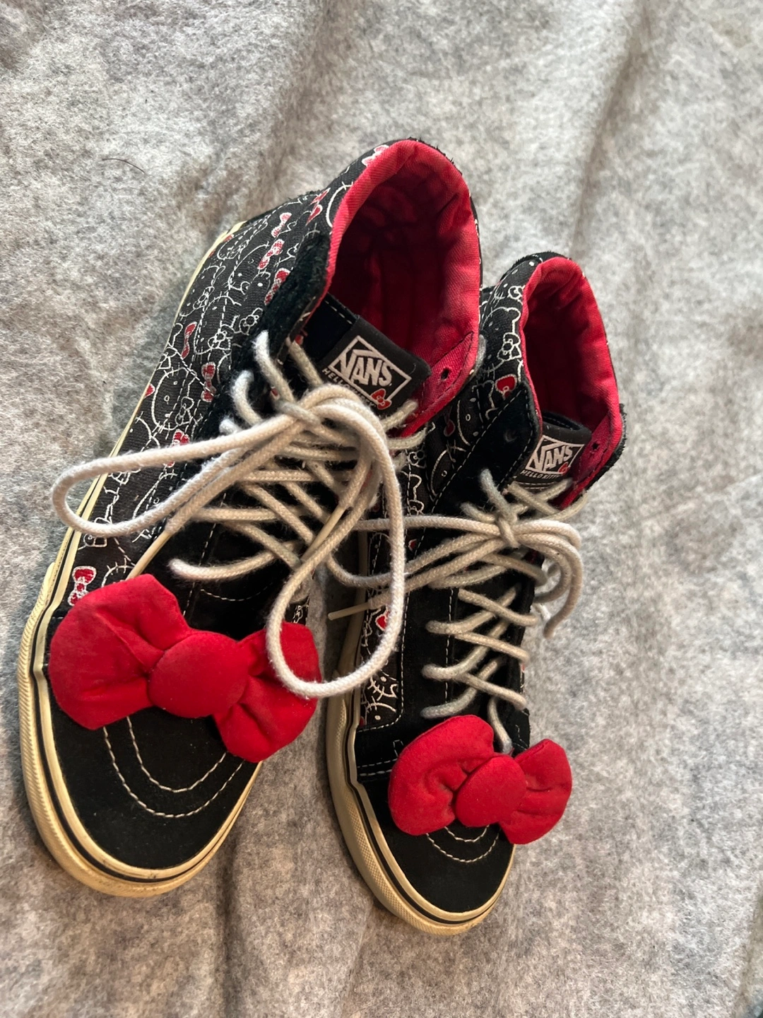 Basically brand new wore inside a few times. Selling a pair of Vans high-top sneakers with a Hello Kitty design! They feature a black and white pattern with Hello Kitty faces and red accents. The shoes have a red interior and a cute red bow on the front. They're in good condition and ready for a new home!