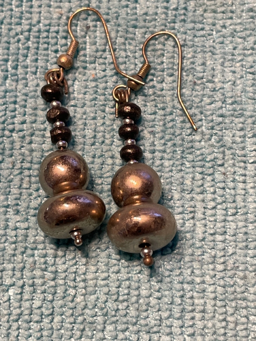 Cute dangle earrings with a mix of round and cylindrical beads. The metal has an antique look, giving them a unique charm. Perfect for adding a bit of flair to any outfit!