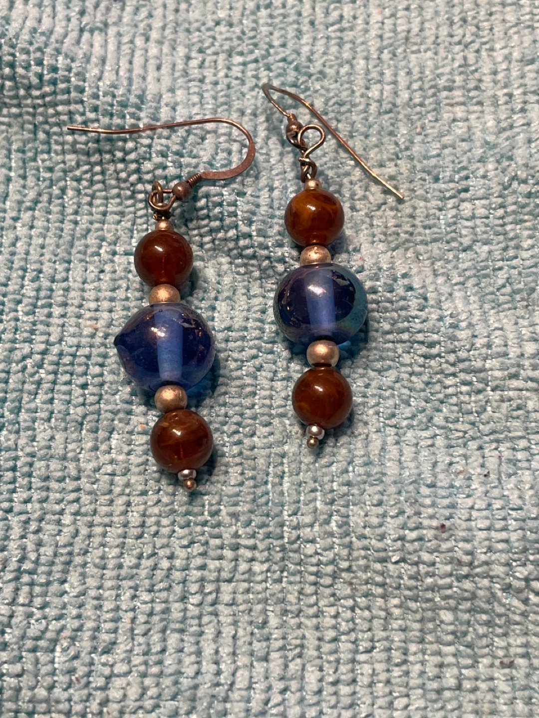 Beautiful handmade dangle earrings featuring brown and blue beads. These earrings are perfect for adding a unique touch to any outfit!