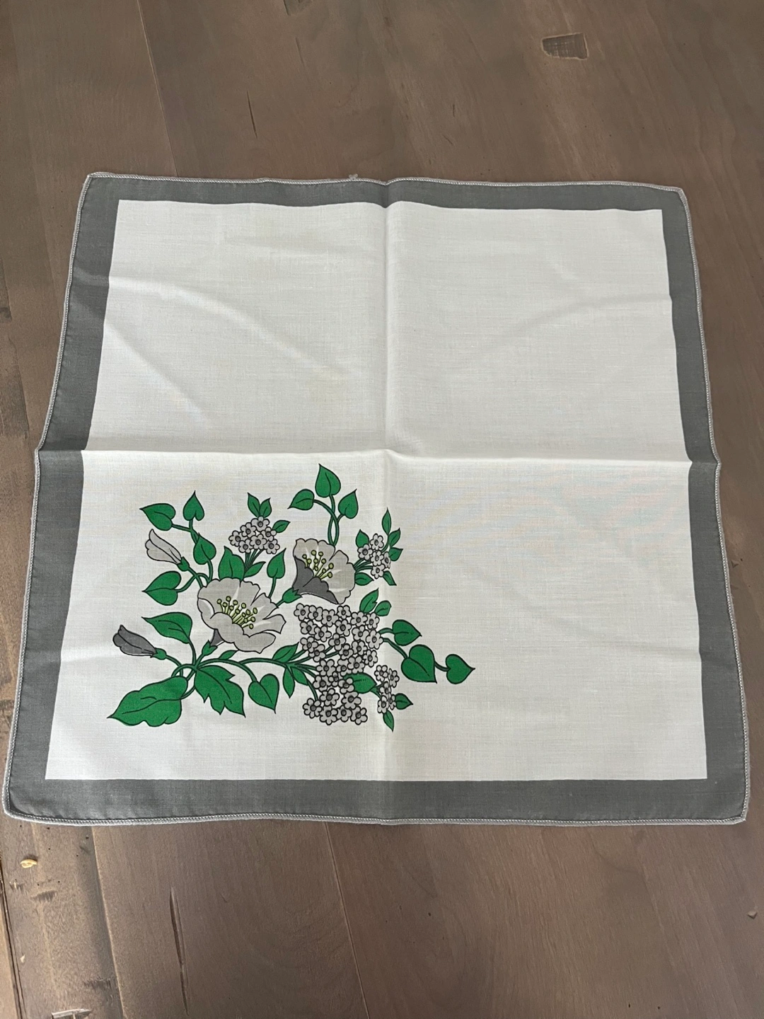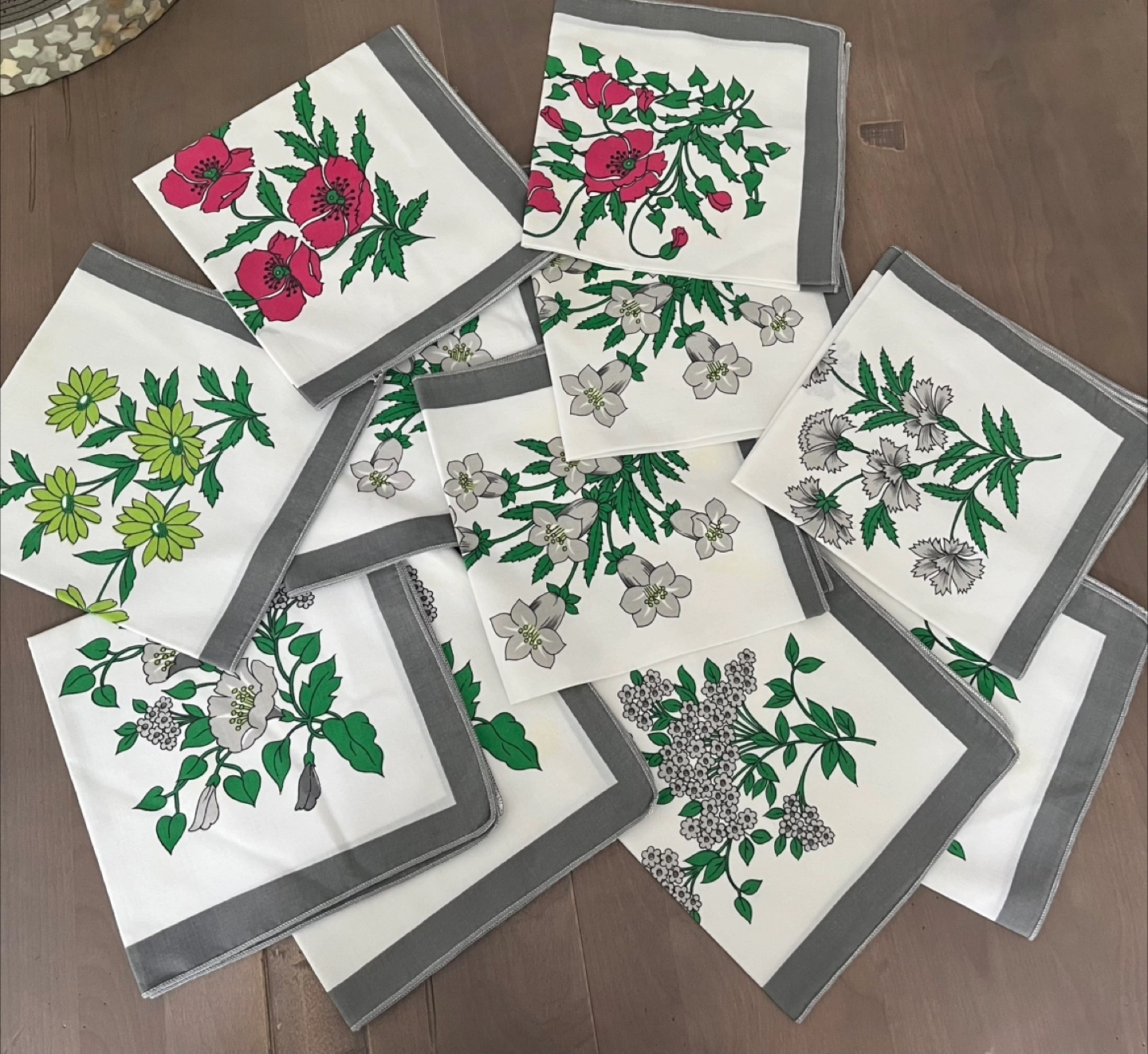 Selling a set of 10 lovely napkinswith floral prints! They feature various floral designs on a white background with a grey border. Perfect for adding a touch of vintage charm to your everyday carry or for crafting projects