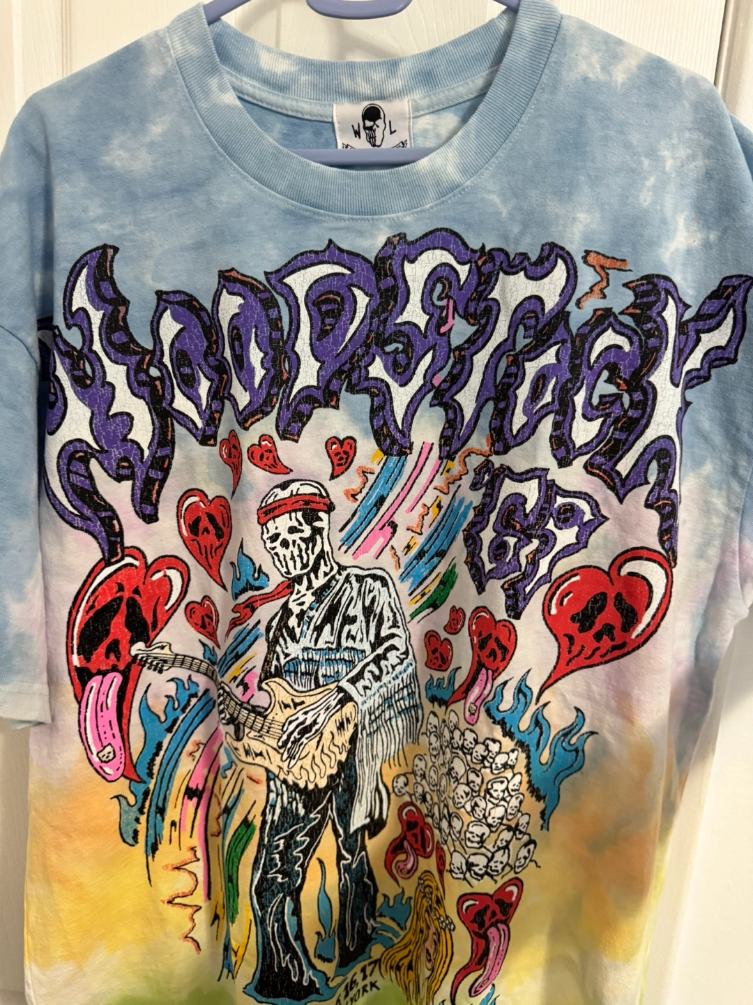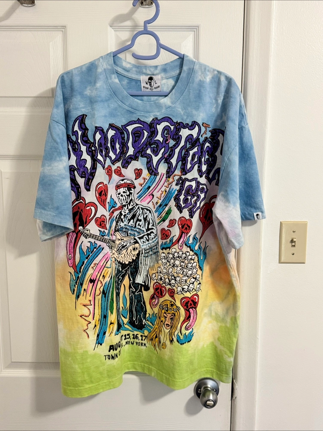 Cool Wasted Land t-shirt up for grabs! It's a size XL and features a vibrant tie-dye design with a Woodstock graphic. Perfect for adding a pop of colour and a bit of rock 'n' roll flair to your wardrobe