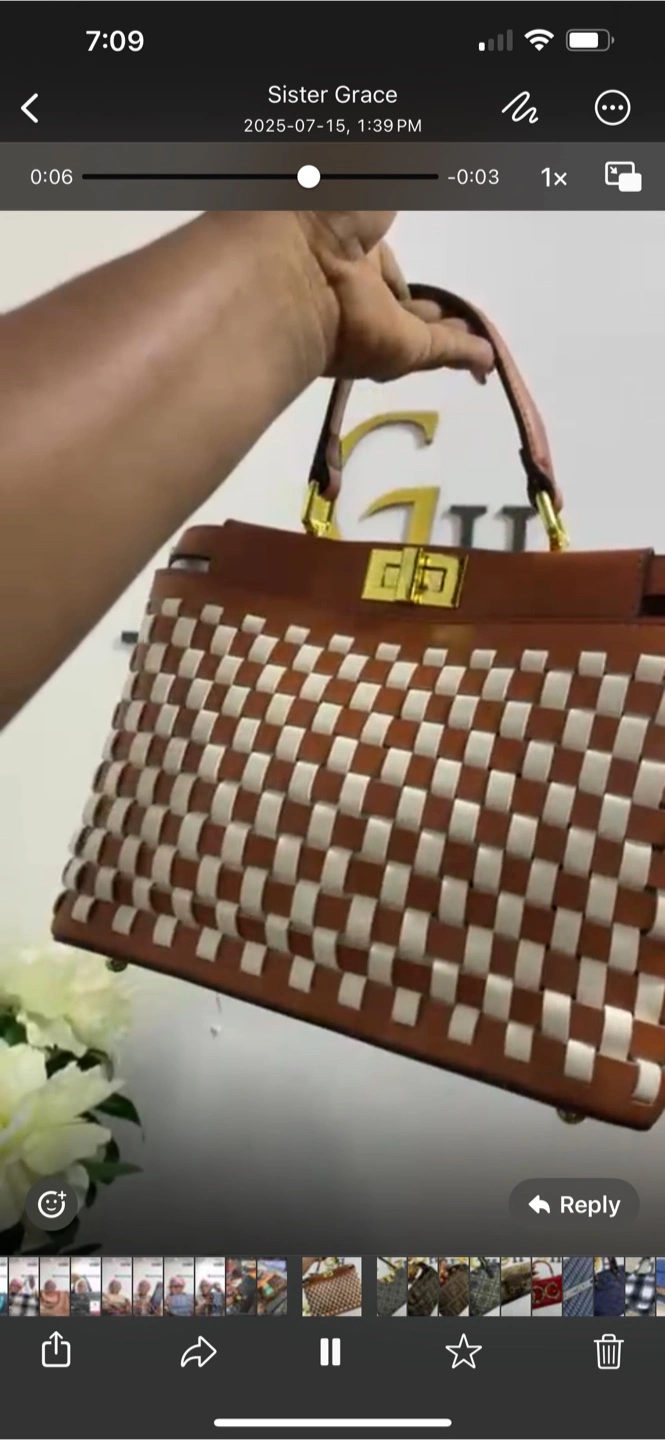 A stylish brown and white woven handbag. The bag features a unique woven pattern and gold-tone hardware. Perfect for adding a touch of elegance to any outfit