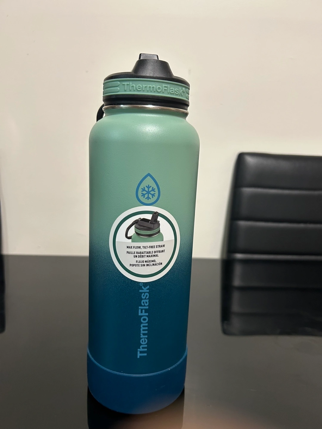 Selling a ThermoFlask water bottle in a cool blue and green ombre color! It holds 40oz and has a tilt-free straw. Perfect for staying hydrated on the go! Never used… Still new